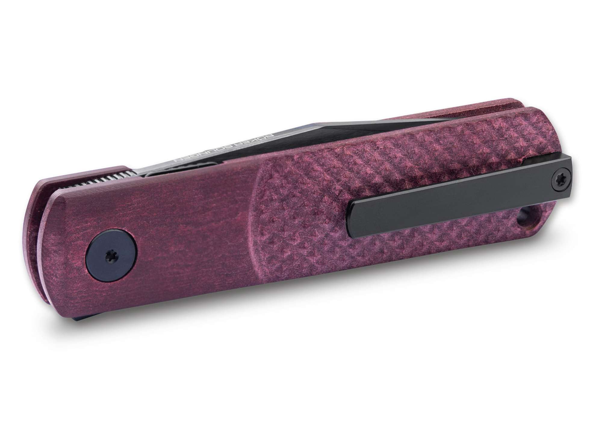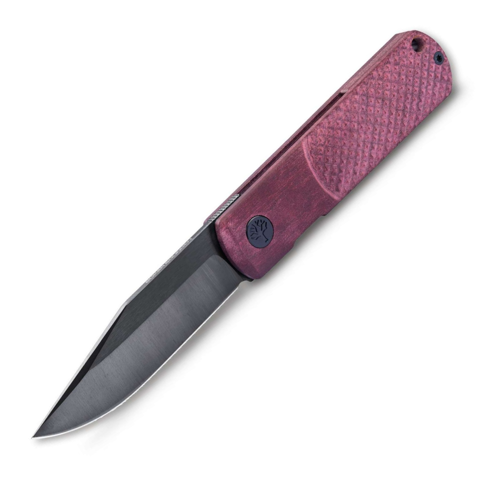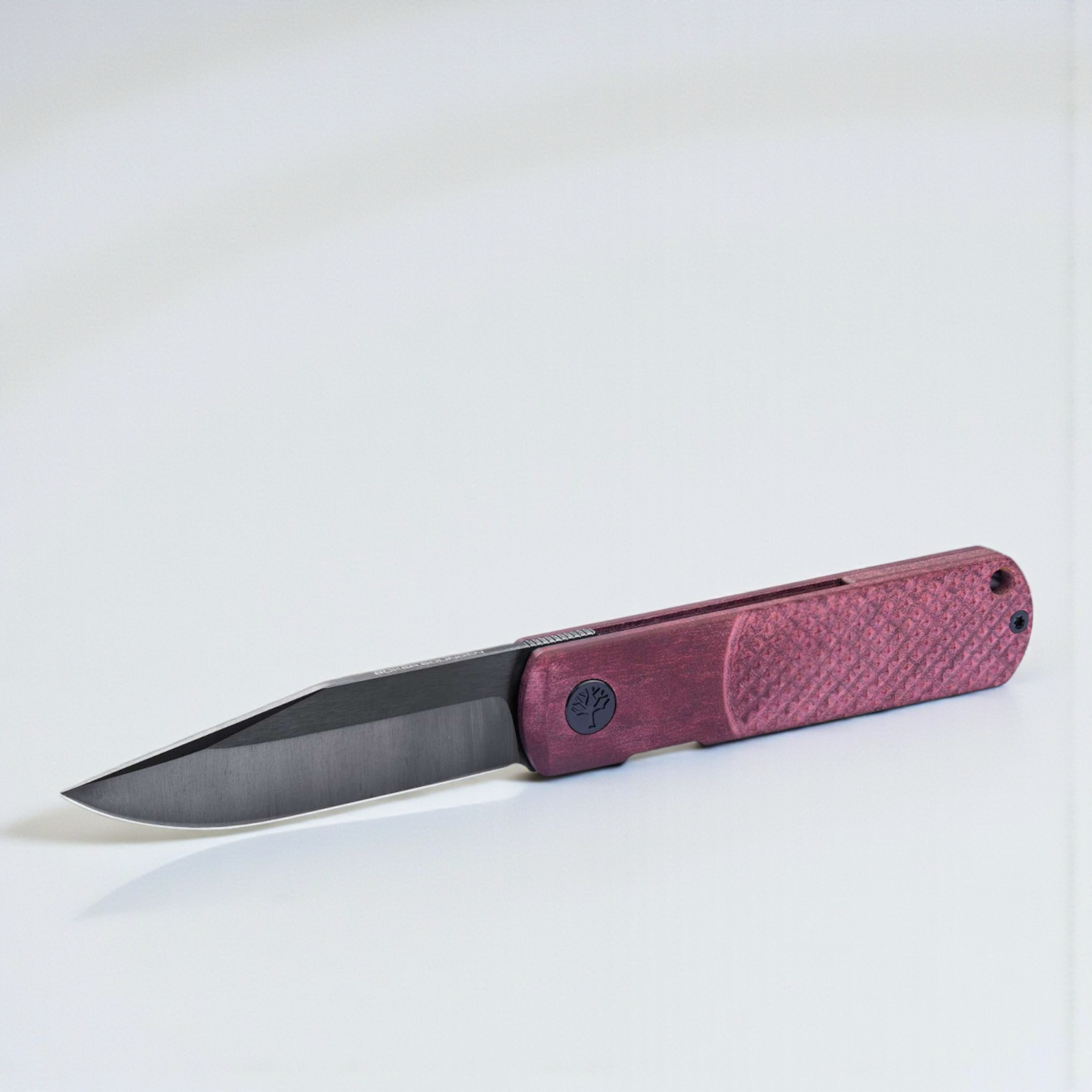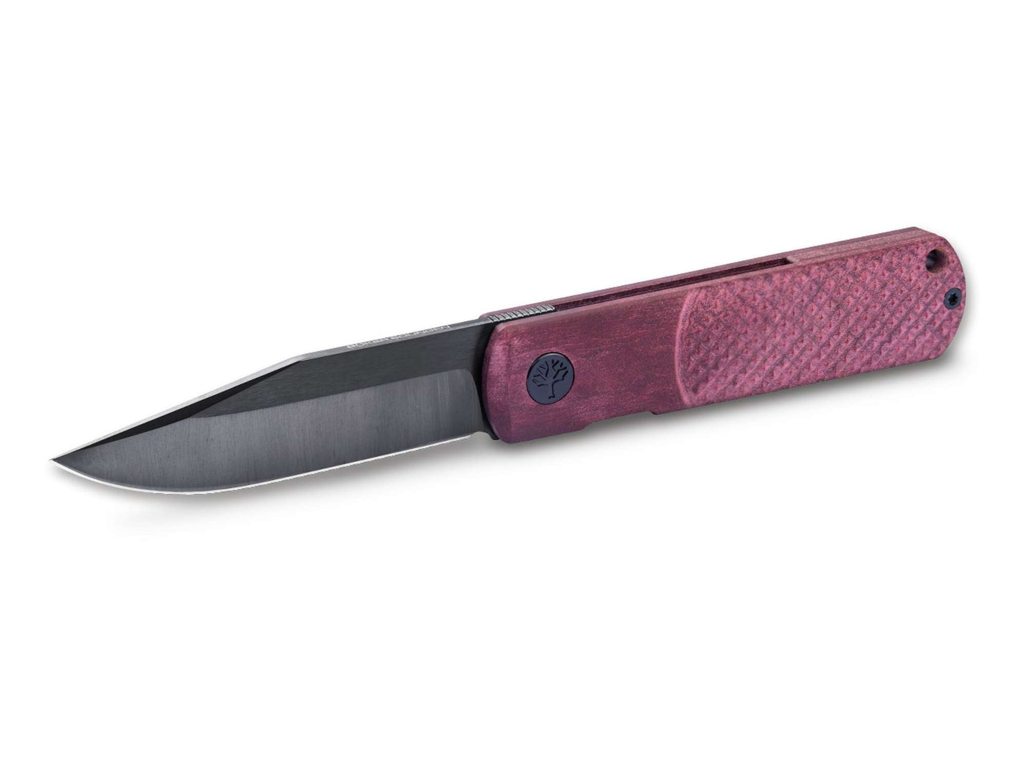 Der Griff aus rotem Richlite setzt einen markanten, hochwertigen Akzent. Das nachhaltige Verbundmaterial überzeugt durch seine warme Haptik, hohe Stabilität und Widerstandsfähigkeit im täglichen Gebrauch. Die ergonomische Form sorgt für eine sichere, kontrollierte Handlage – trotz der kompakten Abmessungen.