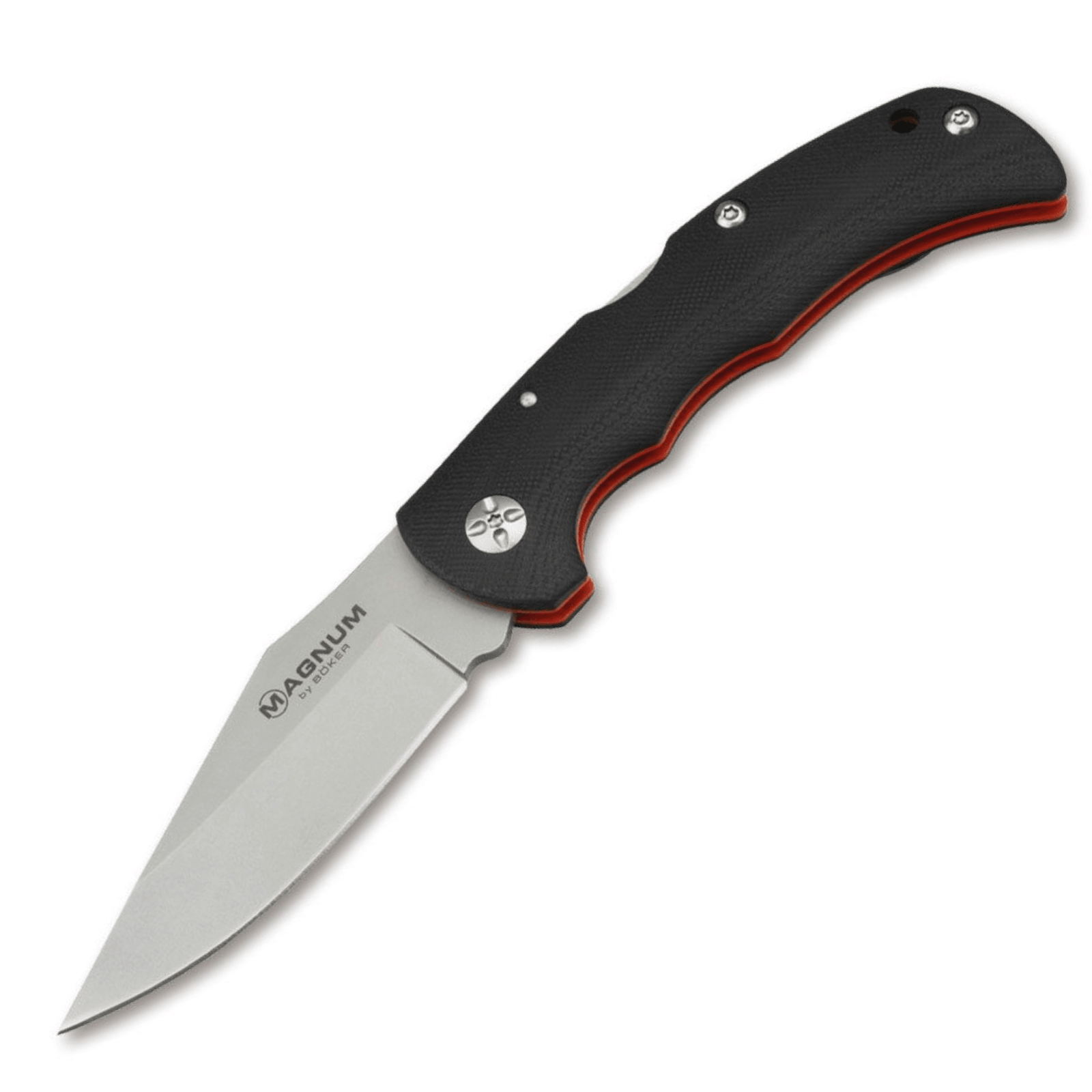 Das moderne Magnum Most Wanted begeistert trotz seines geringen Gewichts mit außergewöhnlicher Stabilität und hervorragender Ergonomie. Der Spacer sowie die texturierten Griffschalen sind aus schwarzem G10 gefertigt und bieten eine ansprechende Optik. Die Griffschalen sind zudem mit einer roten Fiberlage veredelt. Die matte Klinge aus 440A-Stahl wird durch einen robusten Backlock sicher arretiert. Das Messer verfügt über eine dekorative Klingenachsschraube, eine Fangriemenöse und einen Clip (Tip-Up/Rechts).