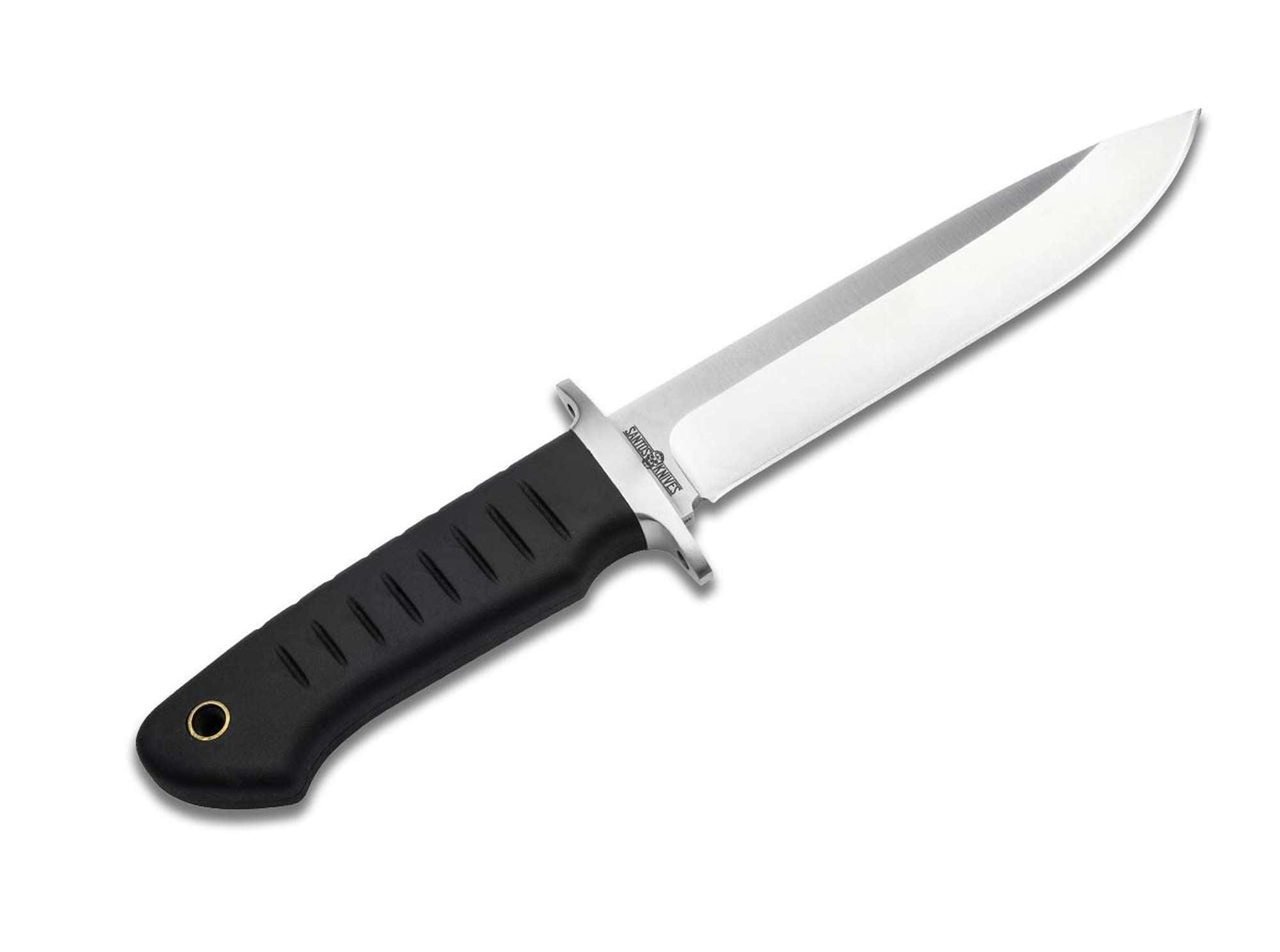Eine Messing-Hohlniete am Griffende dient zur Befestigung von Lanyards. Geliefert wird das Messer mit einer hochwertigen Lederscheide.
