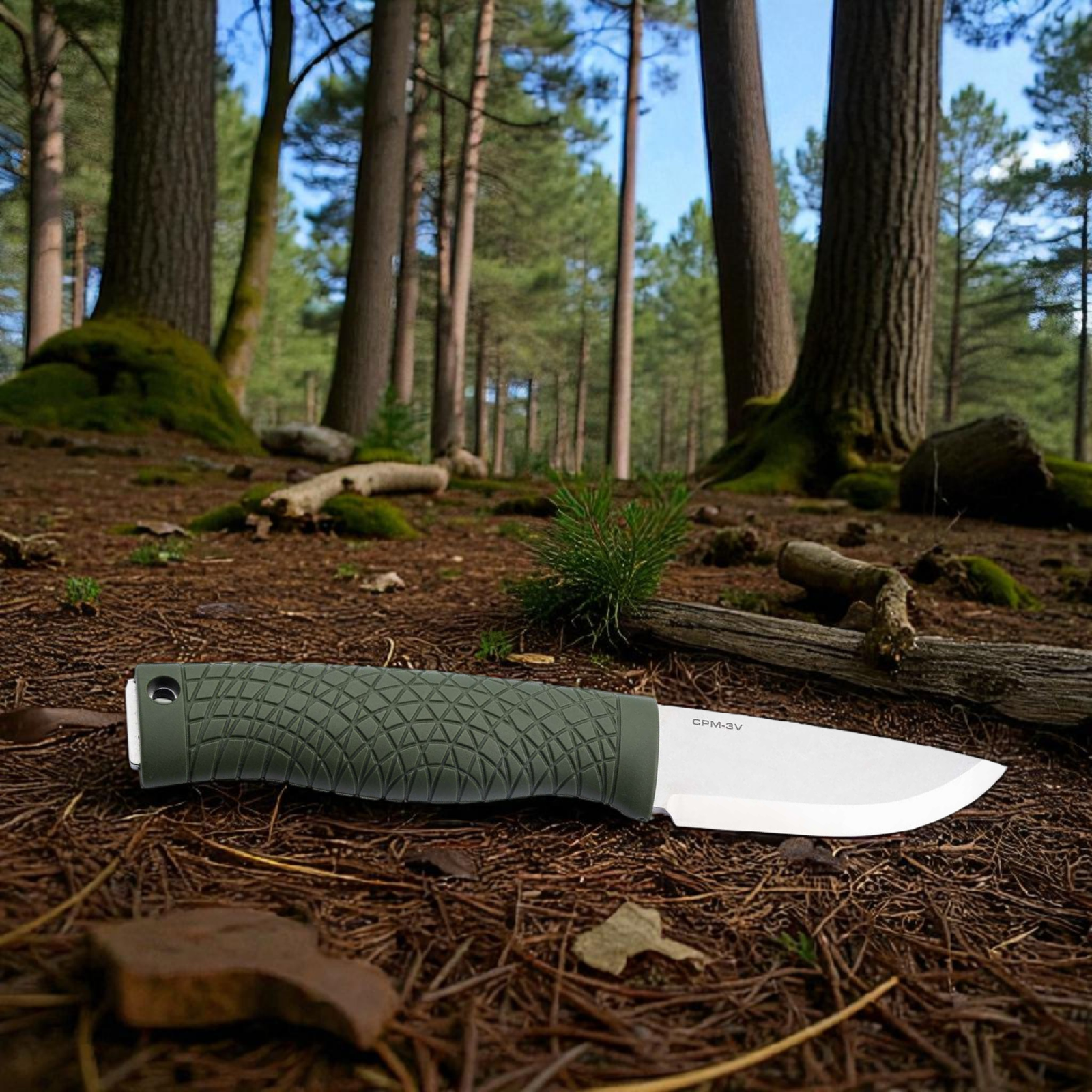 Die Droppoint-Klinge aus pulvermetallurgischem CPM-3V ist für ihre außergewöhnliche Bruchfestigkeit bekannt. Der tief angesetzte Scandi-Schliff prädestiniert das Messer für Schnitzen, Schneiden und kontrolliertes Arbeiten im Holz. Ein kurzer Abschnitt des Klingenrückens verfügt über scharfe 90°-Kanten zum Funkenschlagen mit einem Feuerstarter.