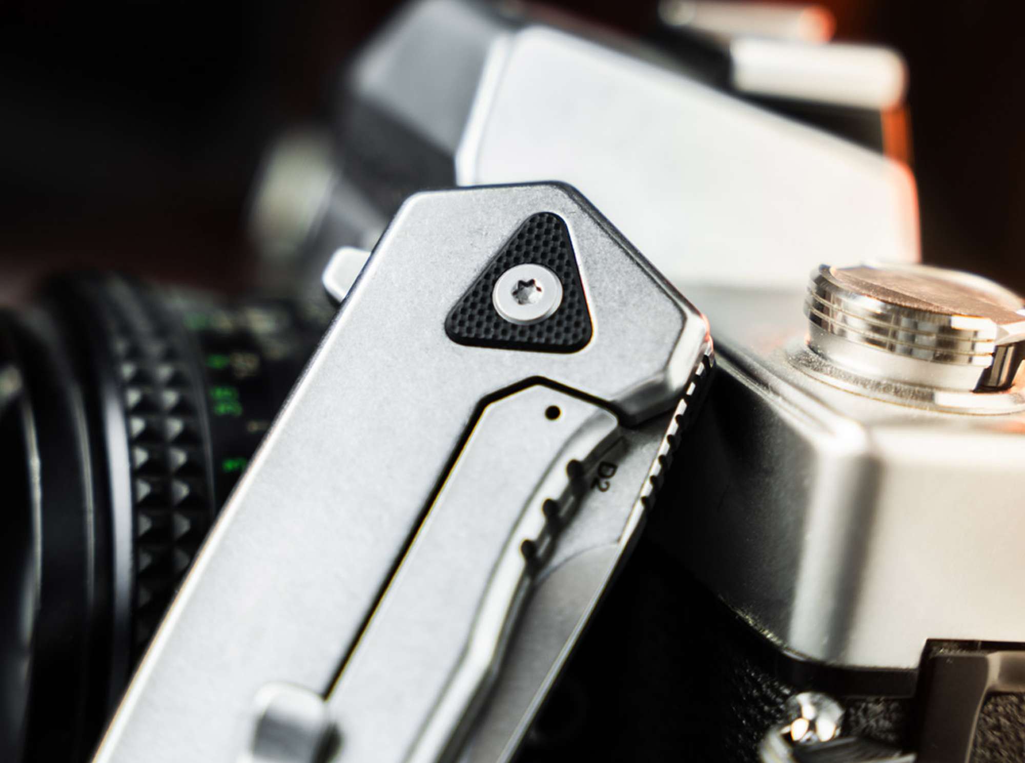 Der Griff kombiniert einen Edelstahl-Frame mit einer vorderen G10-Griffschale in Schwarz. Die dezente, trianguläre Textur sorgt für sicheren Halt – auch bei anspruchsvollen Schneidarbeiten. Abgerundet wird das Messer durch einen schwarzen Backspacer mit Fangriemenöse sowie einen Tip-Up Deep-Carry Clip, der ein diskretes Tragen in der Hosentasche ermöglicht.