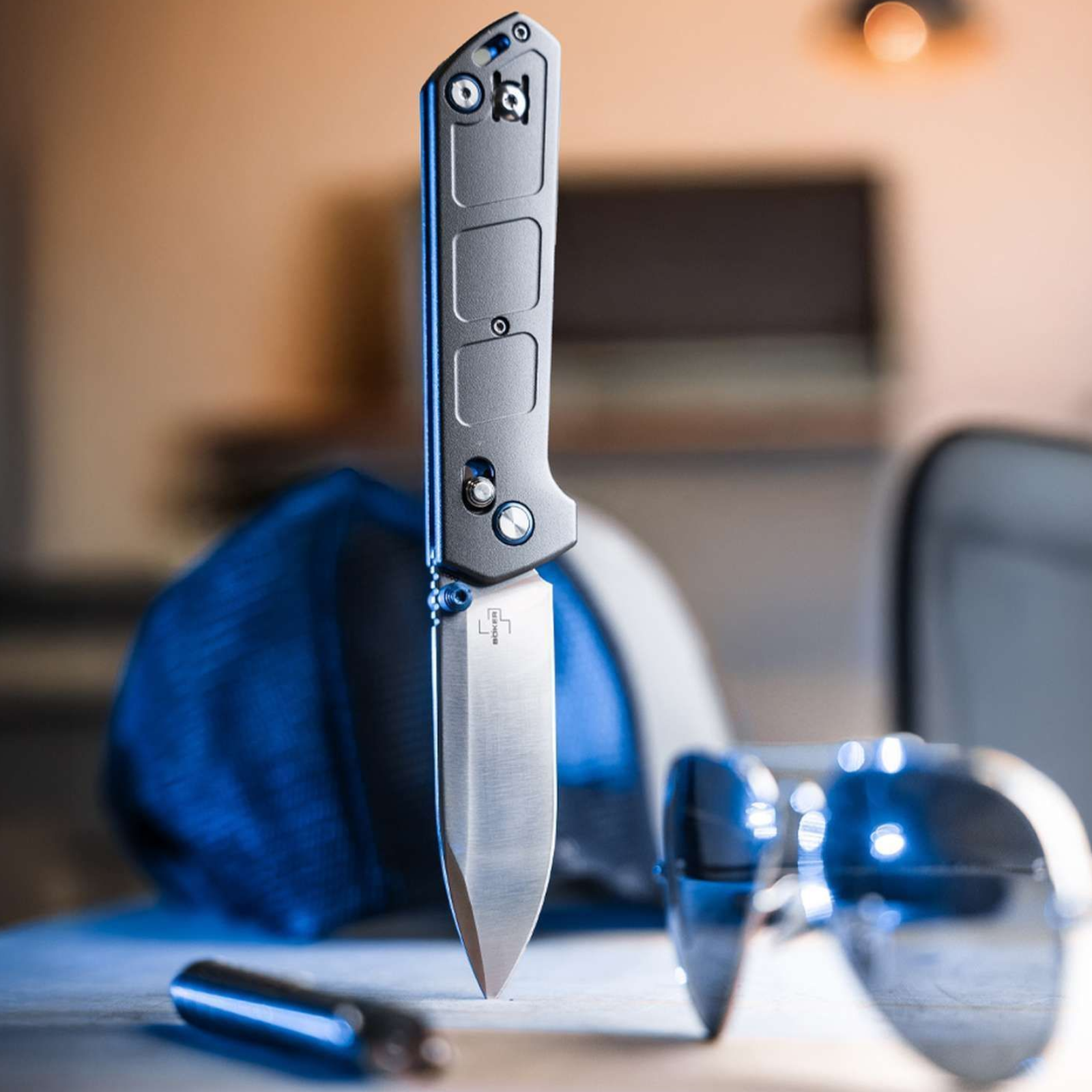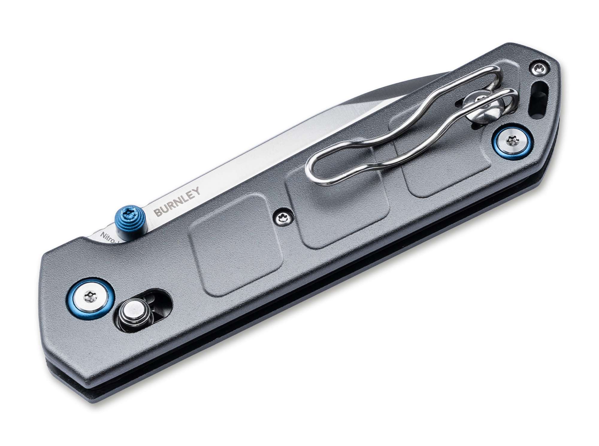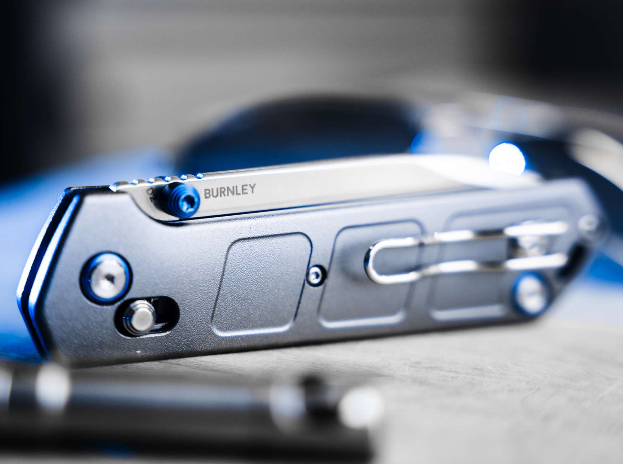 Der hochfeste Aluminiumgriff liegt ausgewogen und angenehm in der Hand. Optische Akzente setzen die blau anodisierten Ringe an Klingenachsschraube, Griffschraube und Daumenpin. Fangriemenöse und umsetzbarer Tip-Up Drahtclip ermöglichen flexible Tragevarianten – ideal als Full-Size EDC.
