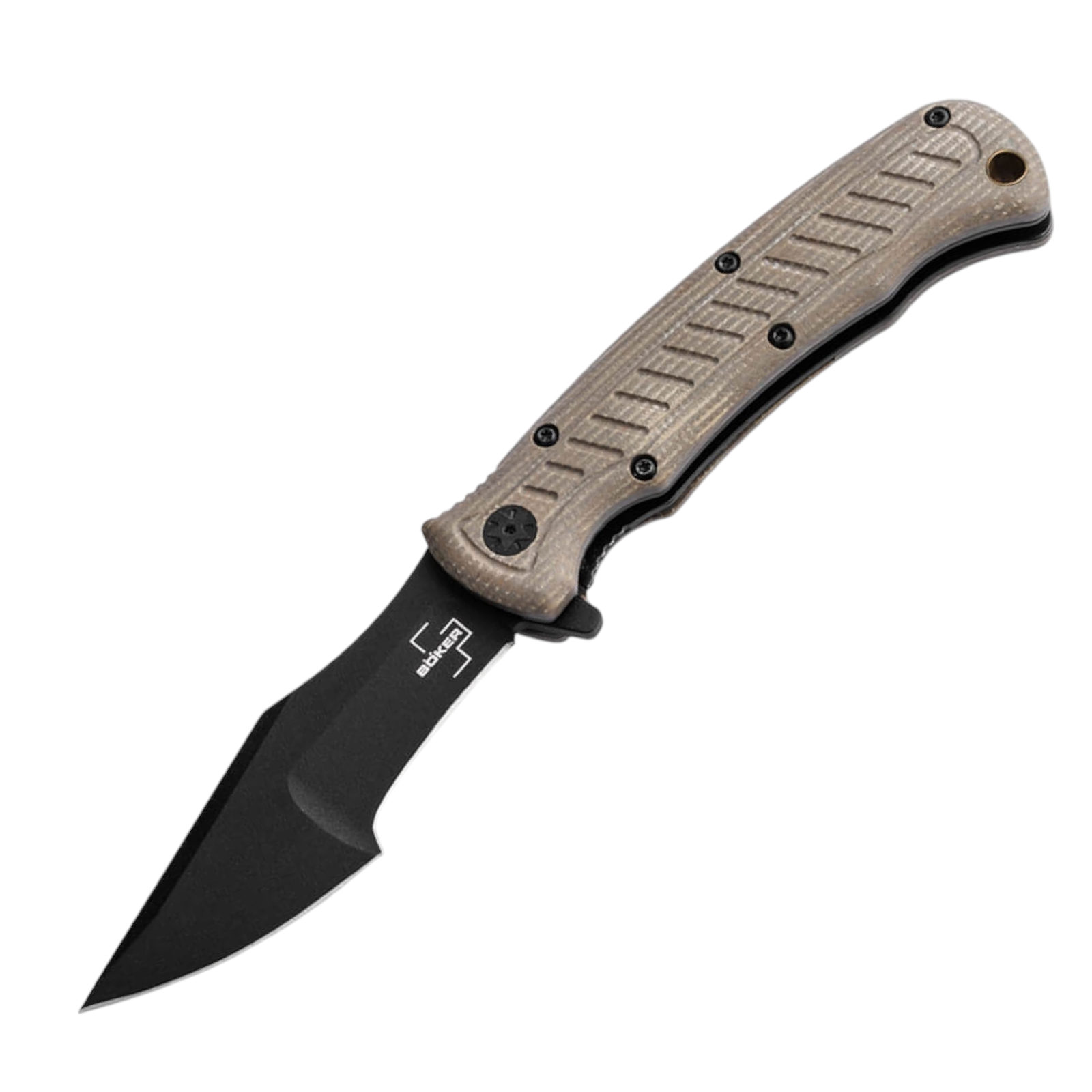 Geöffnet wird das Messer einhandfähig über den Flipper, die Verriegelung übernimmt ein stabiler Linerlock. Die ergonomischen Micarta-Griffschalen sorgen für sicheren Halt und zitieren die feststehenden Tracker-Modelle. Eine Messing-Hohlniete am Griffende dient als Fangriemenöse.