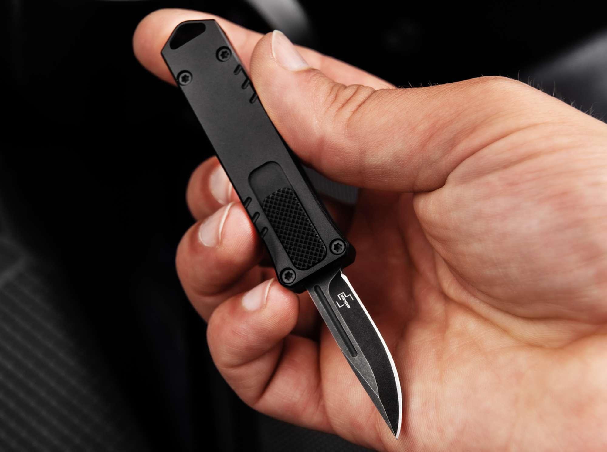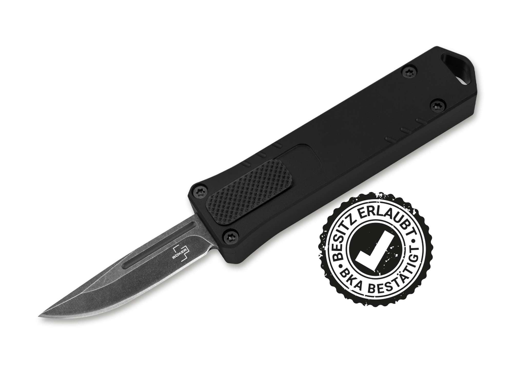 Ein OTF-Messer, kompakt und dynamisch klingt zu schön, um legal zu sein? Böker machts möglich und präsentiert mit dem Böker Plus Micro USB OTF ein in Deutschland gesetzeskonformes OTF-Automatikmesser (Out of The Front) mit einer 41 mm langen Gebrauchsklinge. Möglich macht dies die Einstufung des BKA (Aktenzeichen SO13-2022-36166803; mehr auf www.boker.de), unter welcher das Messer aufgrund seiner geringen Klingenabmessungen nicht als Waffe nach §1 Abs. 2b gilt. Entsprechend der Einstufung des BKA wird das Böker Plus Micro USB OTF vom §42a des WaffG erfasst und unterliegt somit der gewohnten Führungsbeschränkung von Einhandmessern. Das kleine Genie zitiert als handliches Automatikmesser das charakteristische Design gängiger USB-Sticks und setzt auf Biss statt Bytes: Kartons, Verpackungen oder Seile werden mühelos von der schnitthaltigen Klinge aus D2 durchtrennt. Das Springmesser verfügt über einen Schieber auf der Vorderseite des Griffs, der die Klinge mit einem energischen Klacken pfeilschnell aus dem Griff hervorkommen und bei erneutem Betätigen wieder diskret verschwinden lässt. Dank dieser praktischen Einhandbedienung werden kleine Schneidarbeitendes Alltags nahezu im Handumdrehen erledigt.