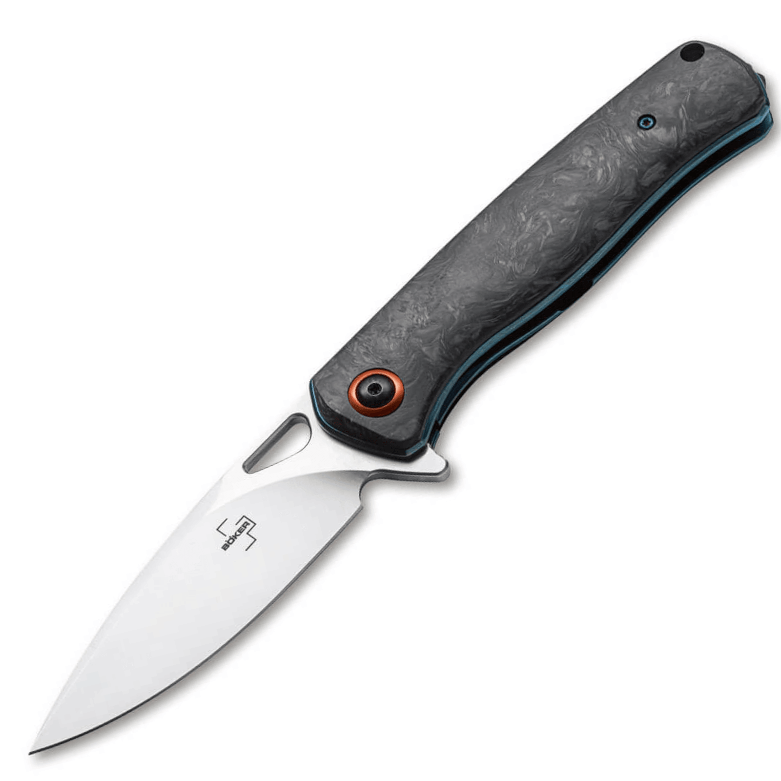 Der Griff des Nebula ist mit konturierten Schalen aus hochwertiger Kohlefaser ausgestattet. Dies sorgt nicht nur für ein modernes und stilvolles Erscheinungsbild, sondern auch für eine exzellente Griffigkeit. Die ergonomische Form und die strukturierten Bereiche der Griffschalen tragen zur Benutzerfreundlichkeit und Sicherheit bei. Farblich abgesetzte Details, wie die blau anodisierten Edelstahl-Liner und der orangefarbene Ring um die schwarze Klingenachsschraube, setzen visuelle Akzente.