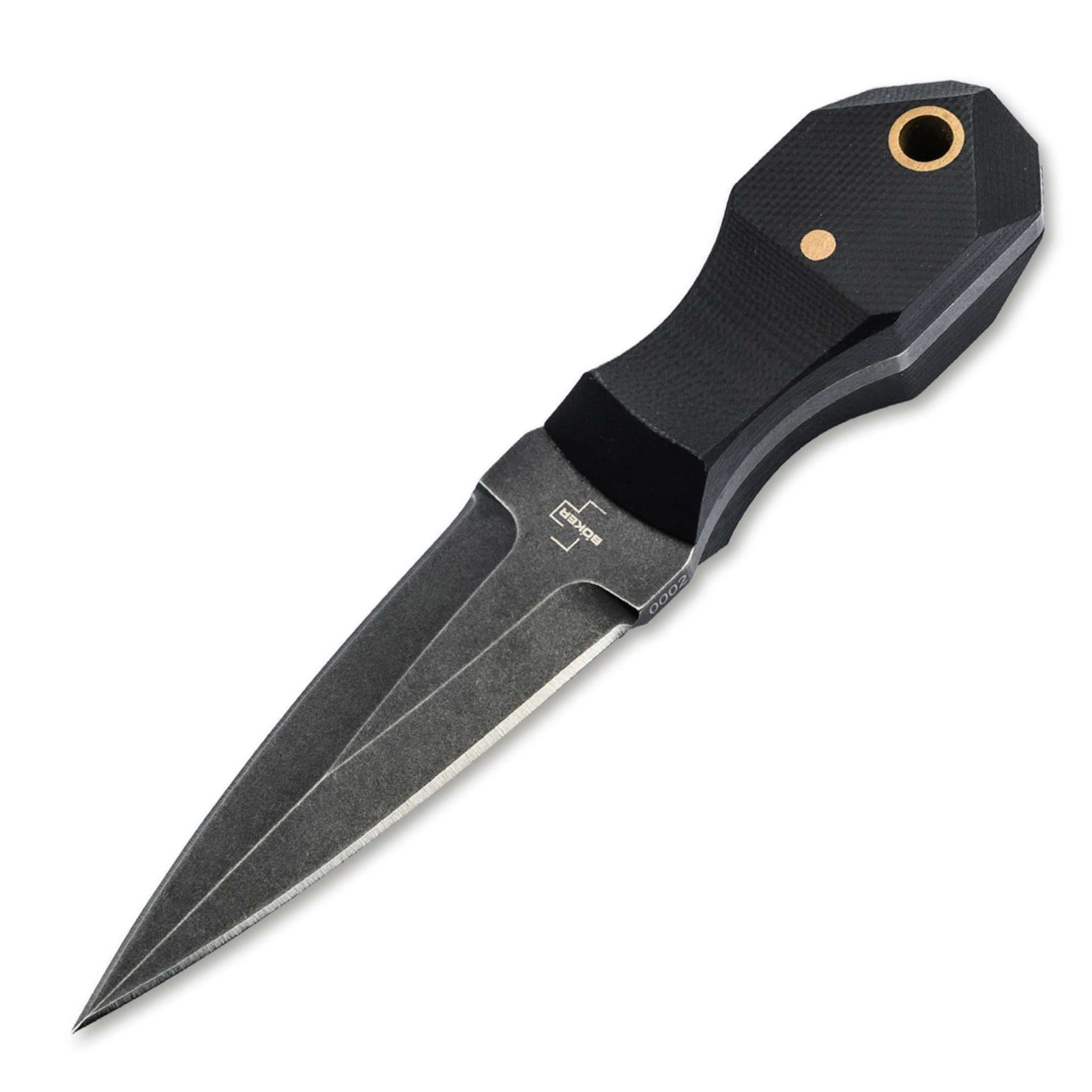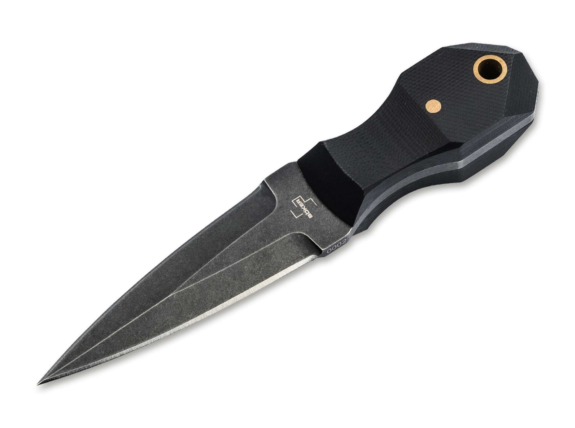 Dieses Neck Knife überzeugt durch seine symmetrische Dolchklinge aus robustem D2-Werkzeugstahl (gehärtet, korrosionsbeständig, schnitthaltig) mit einem dunklen Black-Stonewash-Finish, das nicht nur optisch begeistert, sondern auch unempfindlich gegenüber Gebrauchsspuren ist.
