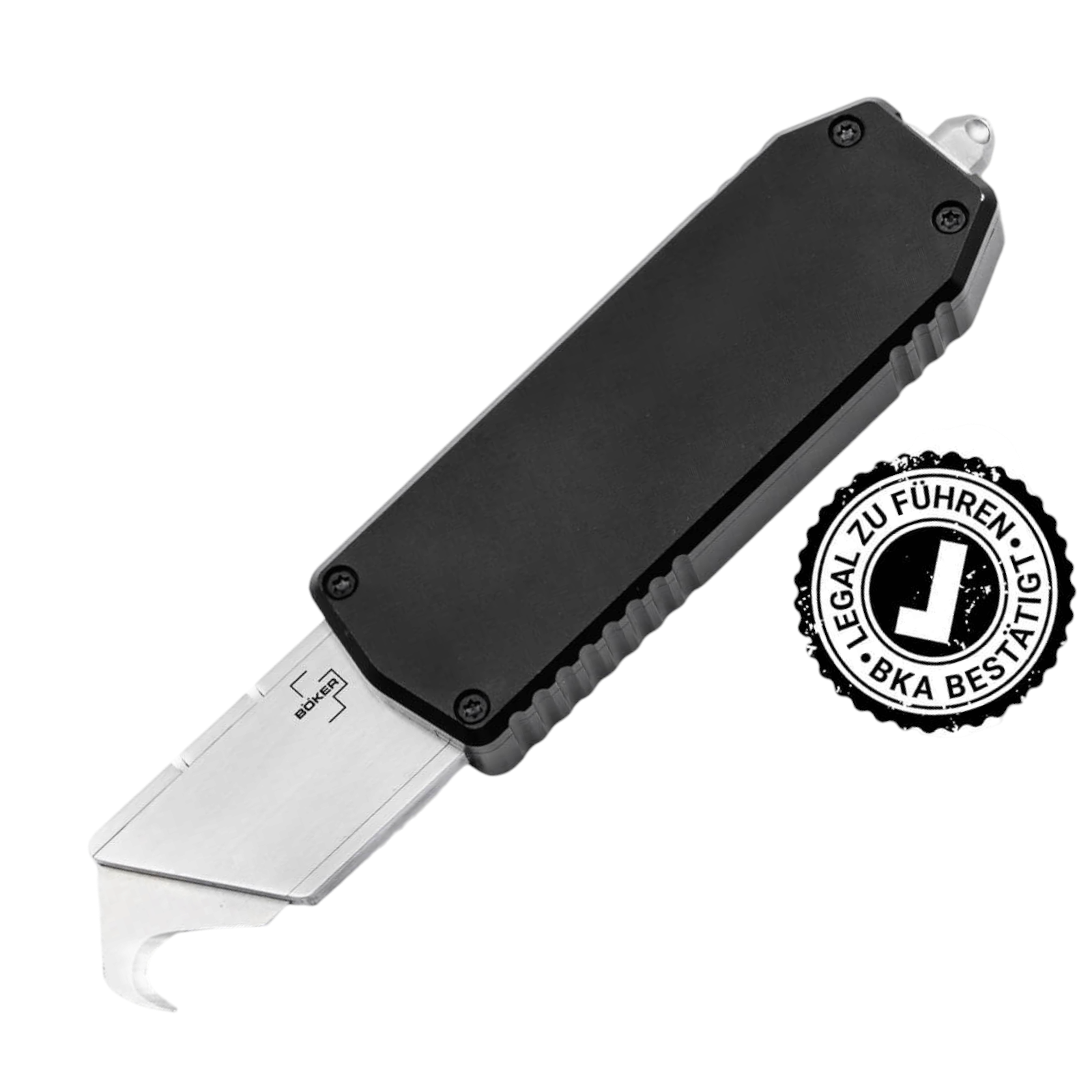 Die Lage: unübersichtlich, hektisch. Das Adrenalin: unkontrolliert. Die Reaktion: entscheidend. In Notsituationen kommt es vor allem auf einen klaren Verstand, Vertrauen in die eigenen Fähigkeiten sowie das richtige Equipment an. Das Böker Plus Utility OTF Rettungswerkzeug behält auch in brenzligen Situationen immer einen kühlen Kopf, um jederzeit Herr der Lage zu bleiben. Inspiriert von den bewährten Böker Plus und Magnum Rettungsmessern verbindet das clevere Notfallwerkzeug wie keine zweite Vielseitigkeit mit hoher Anpassungsfähigkeit, Zuverlässigkeit und intuitiver Bedienung. Ausgestattet mit dem geschätzten, von Springmessern bekannten OTF-Mechanismus (out the front) schnellt beim Betätigen des rutschfesten, an der Oberseite des Tools befindlichen Daumenschiebers der Klingenhalter mit klanggewaltiger Dynamik aus der Vorderseite des Griffs hervor- und bei erneuter Betätigung wieder hinein. Die verwendete Hakenklinge ist am vorderen Ende abgerundet und auf der Innenseite angeschliffen. Im Falle eines Unfalls wird somit sichergestellt, dass Kleidung und Gurte zuverlässig durchtrennt werden können, ohne dabei den Verunfallten zu verletzen. Sollte die Klinge einmal an Schärfe verlieren oder beschädigt werden, kann sie im Handumdrehen gewechselt und in der Klingenhalterung fixiert werden. Maximale Stabilität verspricht der schwarze Griff aus hochfestem Aluminium, der eine aufgeräumte Optik mit kompromissloser Funktionalität vereint. Riffelungen an neuralgischen Punkten sorgen für einen außergewöhnlichen Halt, während der Glasbrecher am Griffende im Notfall Leben retten kann. Das Bundeskriminalamt (BKA) teilt diese Auffassung und stuft das Böker Plus Utility OTF als ein im Besitz erlaubtes und in Deutschland öffentlich frei führbares Rettungstool ein, da es im Sinne des Deutschen Waffengesetzes (WaffG) gemäß Feststellungsbescheid (Aktenzeichen SO13-5164.01-Z-558) nicht den üblichen Waffen- und Verbotskriterien entspricht. Mit Tip-Up Clip (r) für eine diskrete Deep-Carry-Trageweise sowie Edelstahl-Wechselklinge mit Rettungshaken. Böker Plus Utility OTF - RescUtility in Reinform!