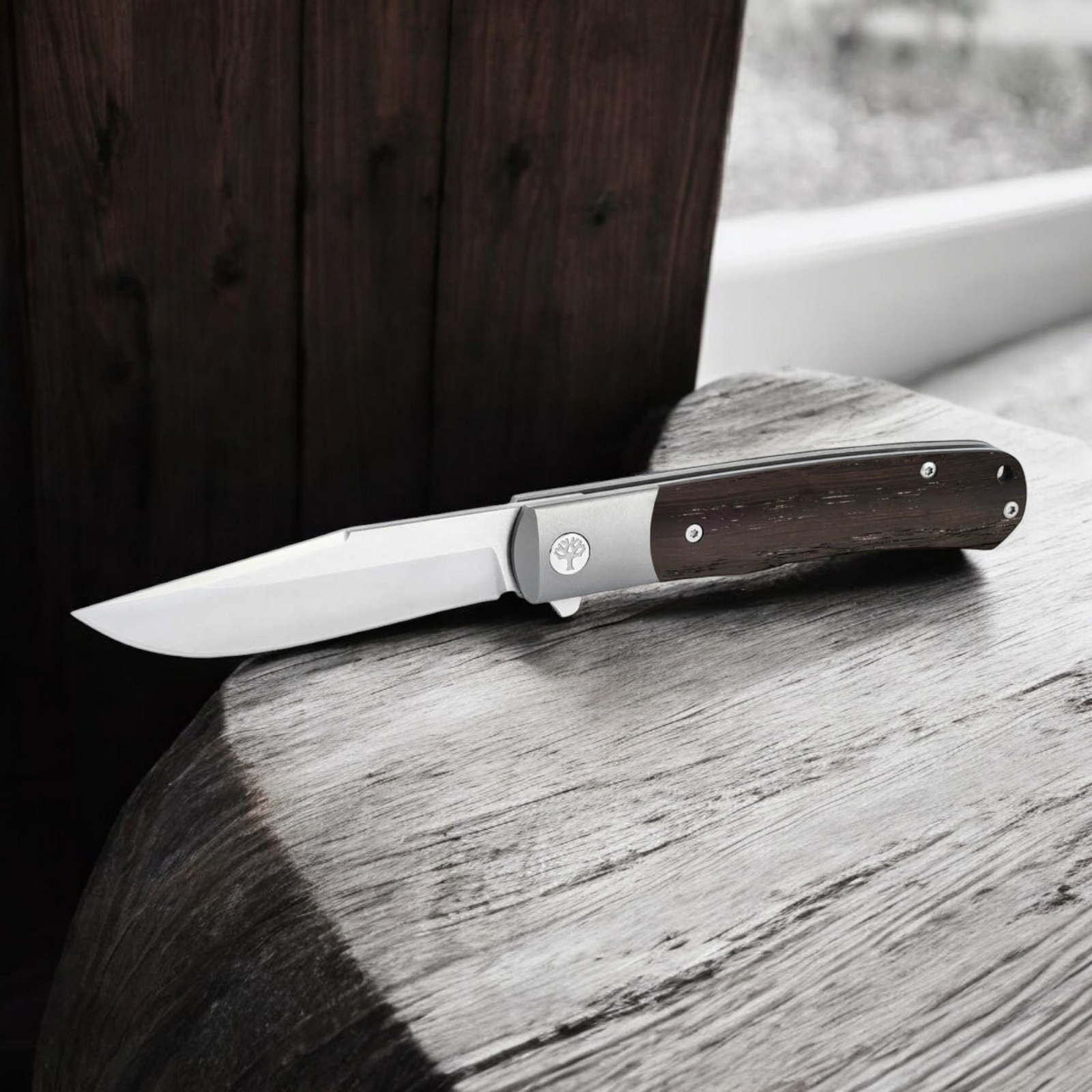 Der Griff besteht aus edler Mooreiche, einem fossilen Eichenholz, das über Jahrhunderte in Mooren konserviert wurde. Dieses seltene Material verleiht jedem Messer ein individuelles, dunkles und besonders stilvolles Erscheinungsbild. Der integrierte Titan-Framelock mit Overtravel-Stop garantiert eine sichere Verriegelung der Klinge und ergänzt das hochwertige Gesamtpaket.