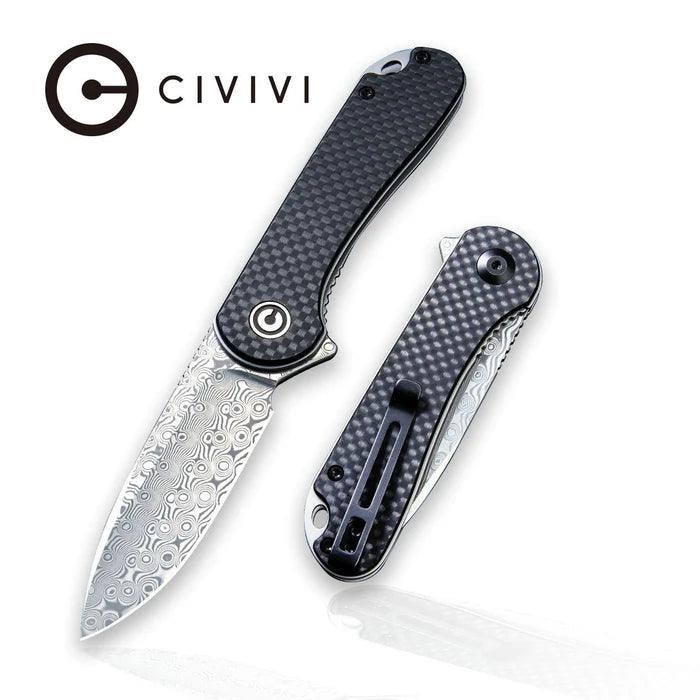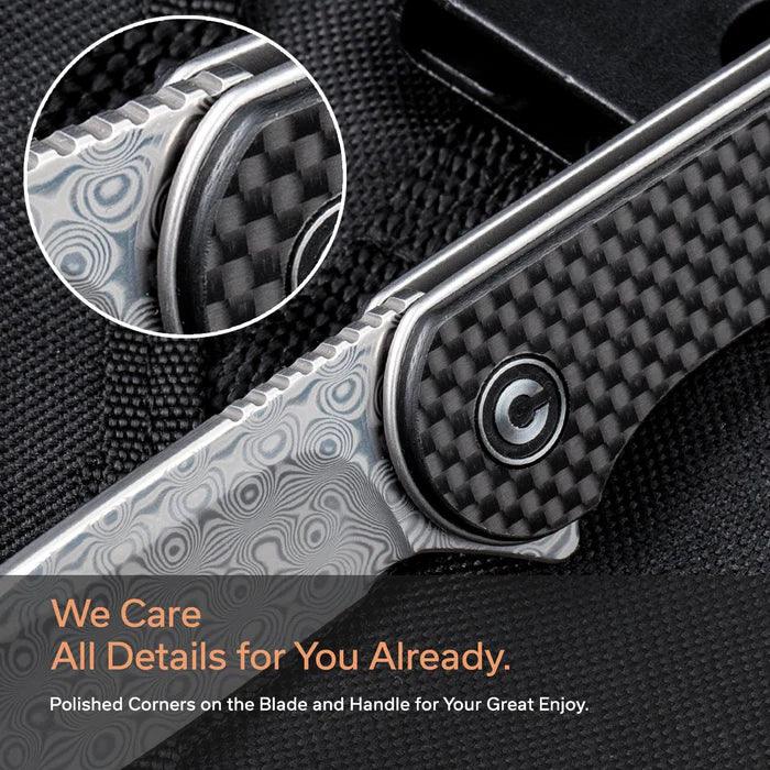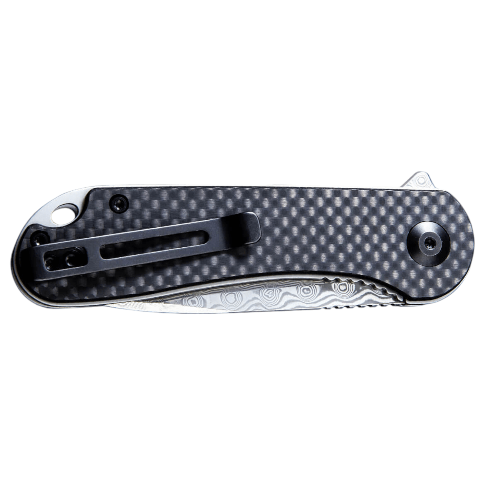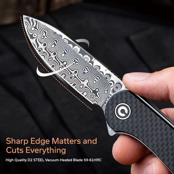 Das Modell C907DS von CIVIVI, auch bekannt als Elementum, ist ein kompaktes und elegantes Klappmesser mit hochwertigen Materialien und einer präzisen Verarbeitung. Es verfügt über eine Klinge aus Damaststahl, die eine hohe Härte von HRC 59-61 erreicht und in einem hohl geschliffenen Design gefertigt ist, das sich durch seine Schärfe und Schneidleistung auszeichnet. Der ergonomische Griff besteht aus G10-Material mit einer Kohlefaser-Beschichtung, was nicht nur für ein leichtes Gewicht, sondern auch für eine erstklassige Haptik sorgt.