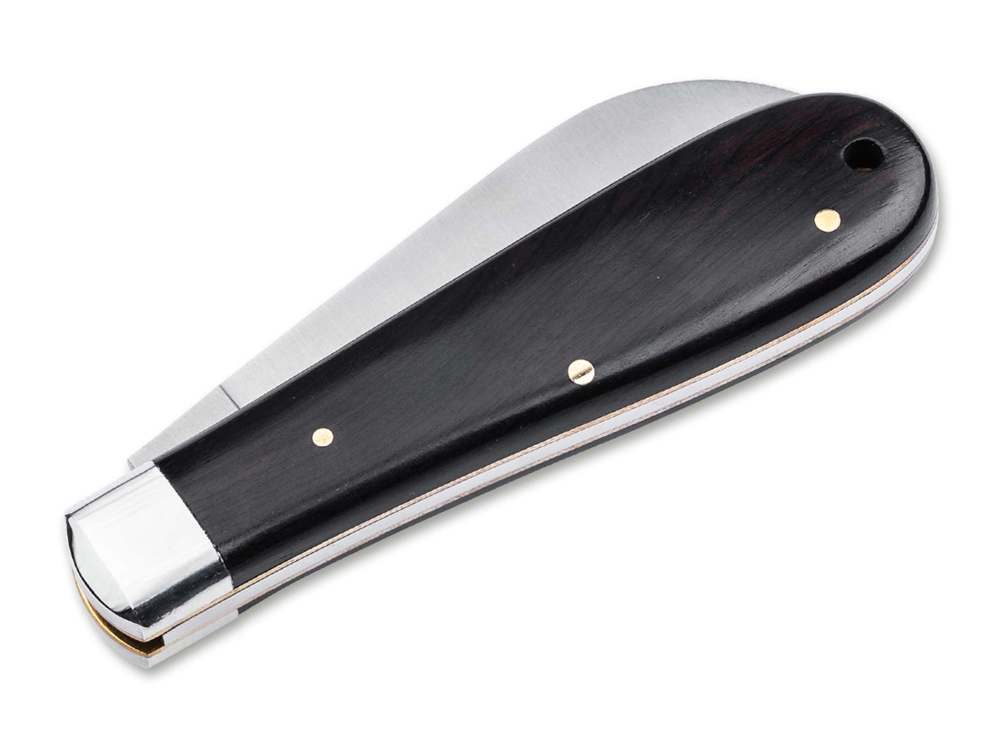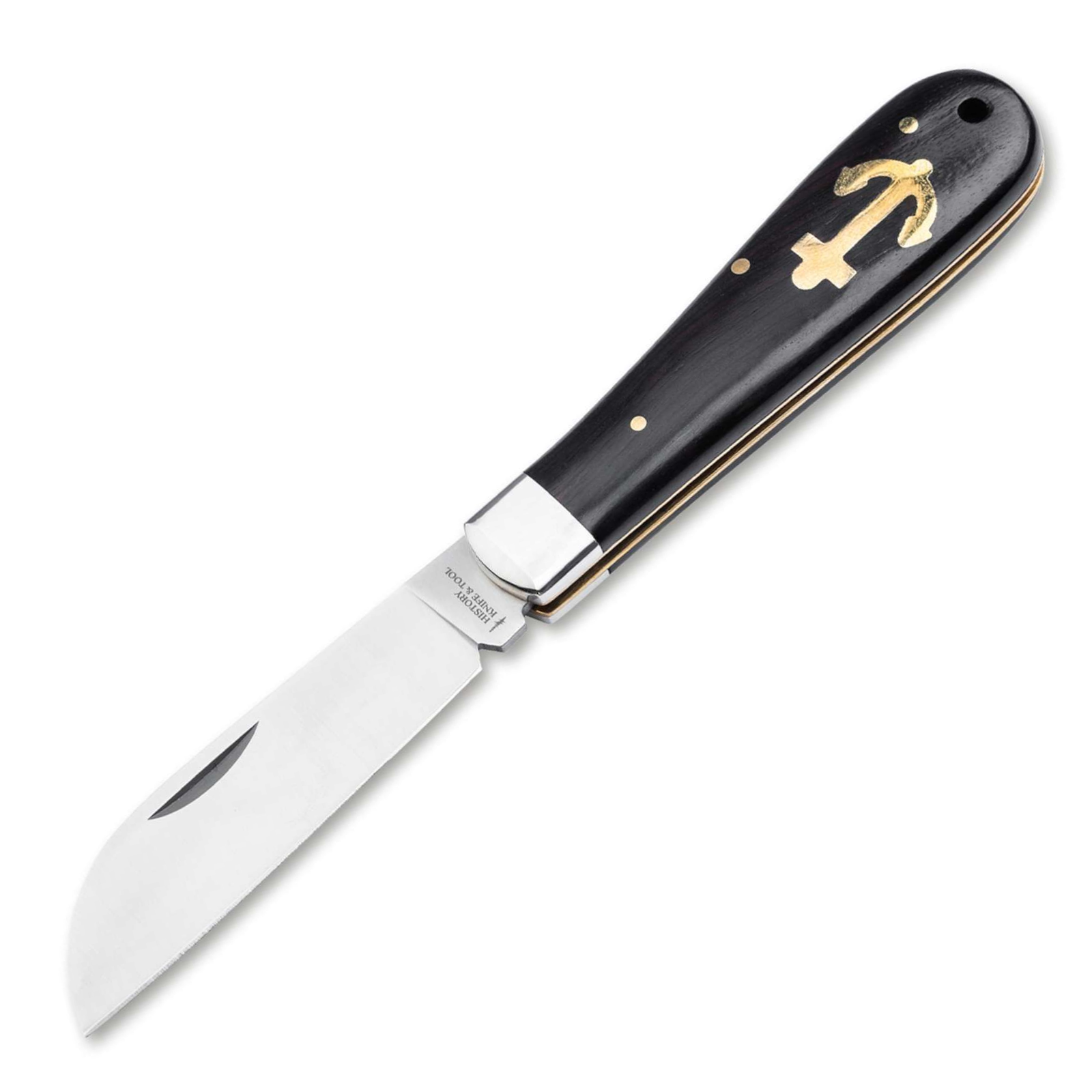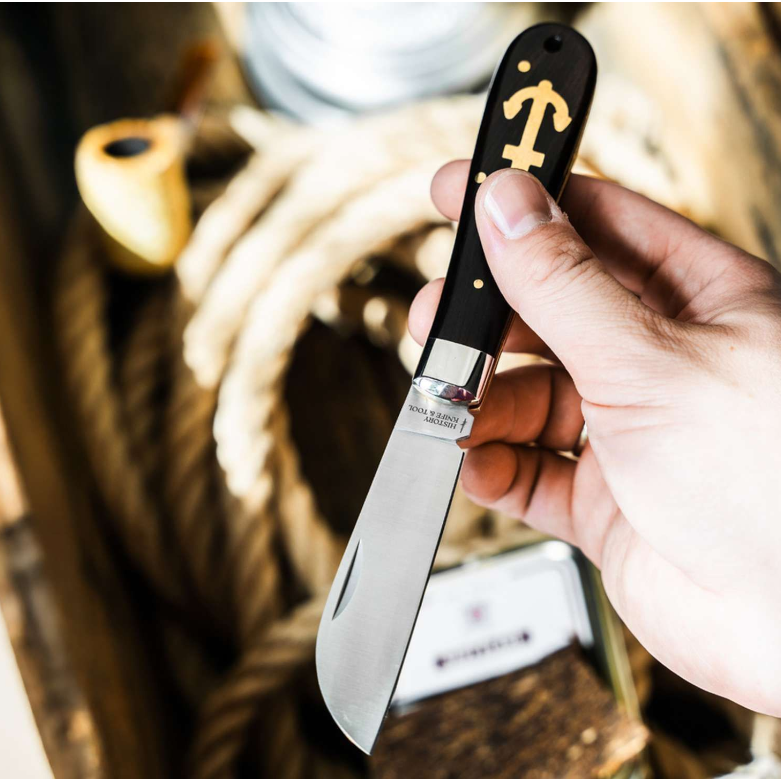 Typisch für dieses traditionelle Ankermesser sind der seewasserbeständige Griff aus Ebenholz, der aufwendig eingelegte Anker aus massivem Messing sowie die funktionale Sheepsfoot-Klinge, die speziell für Arbeiten mit Tauen und Seilen entwickelt wurde. Die klassische Slipjoint-Konstruktion sorgt für einfache, zuverlässige Handhabung ohne Verriegelung.