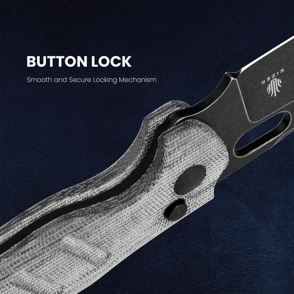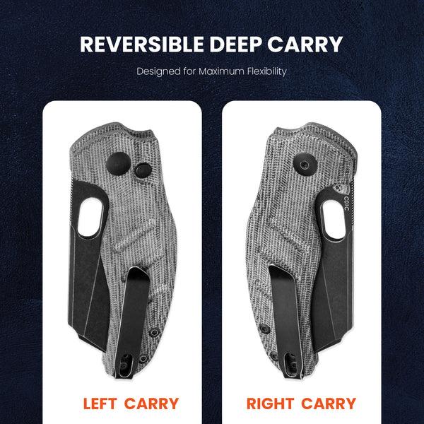 Das Messer verfügt über einen Daumenloch-Öffner und ein Button-Lock-Design, was die Bedienung besonders einfach und flüssig macht – ideal für Anfänger. Zusätzlich ist es mit einem umsetzbaren Deep-Carry-Clip ausgestattet, sodass Sie die Tragemethode ganz nach Ihren Vorlieben anpassen können.