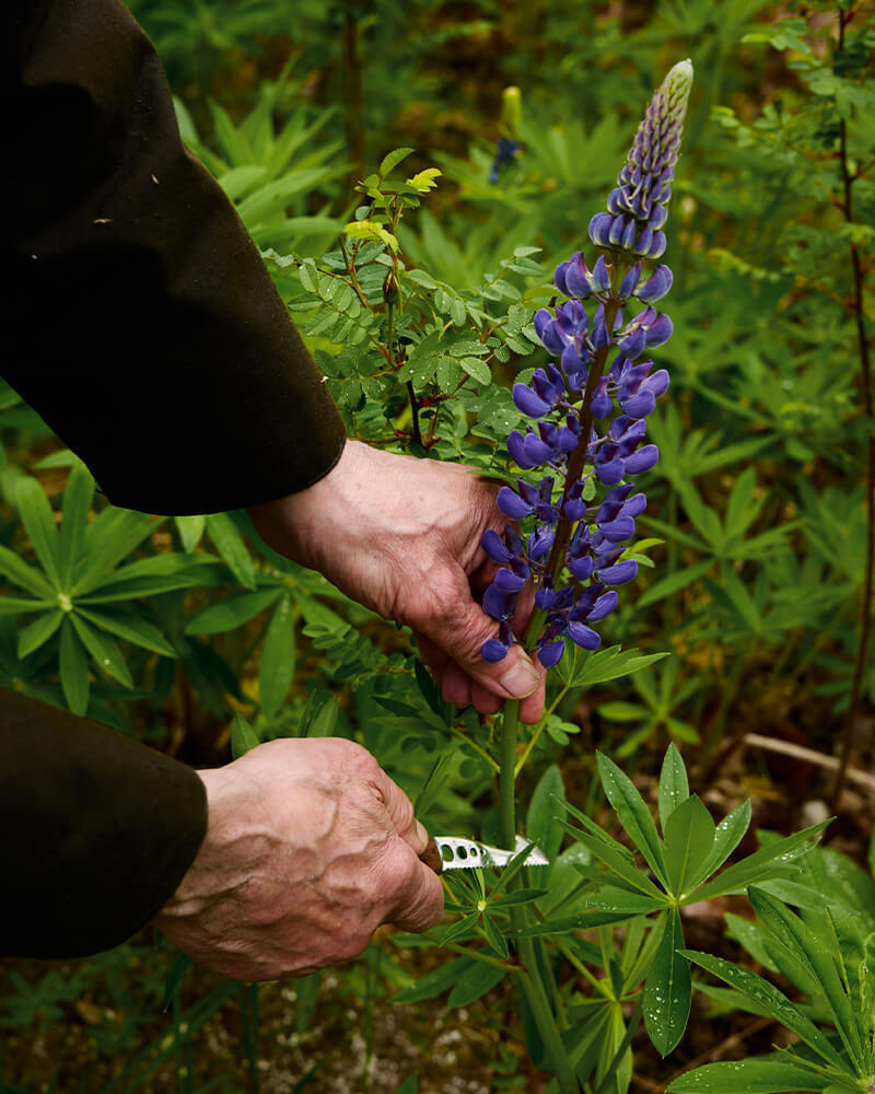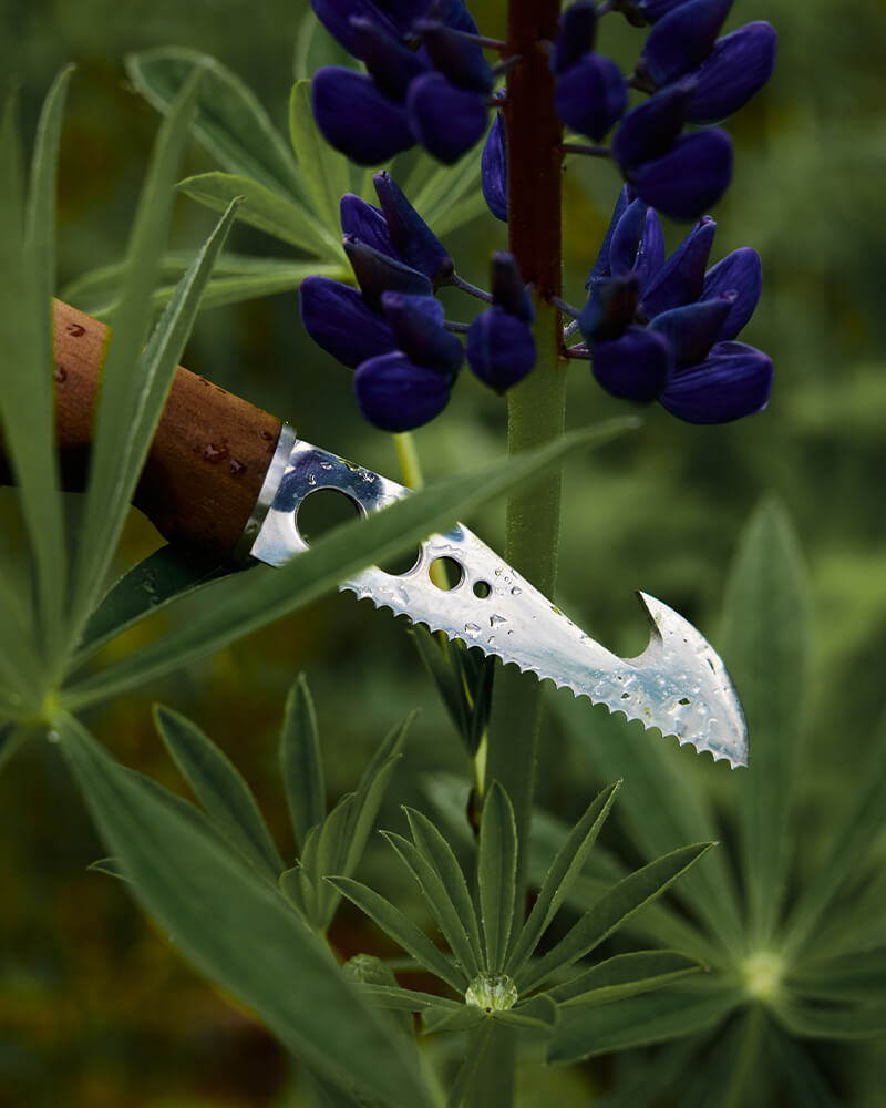 Ein Wellenschliff und Haken ermöglichen das saubere Schneiden und Ernten stärkerer Pflanzen – ideal zum Beispiel für Lupinen oder dickstielige Kräuter.
