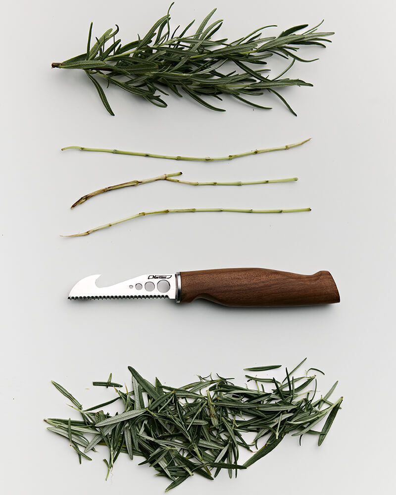 Lochungen in der Klinge erleichtern das Entfernen von Blättern kleiner Kräuter wie Rosmarin, Minze oder Basilikum.
