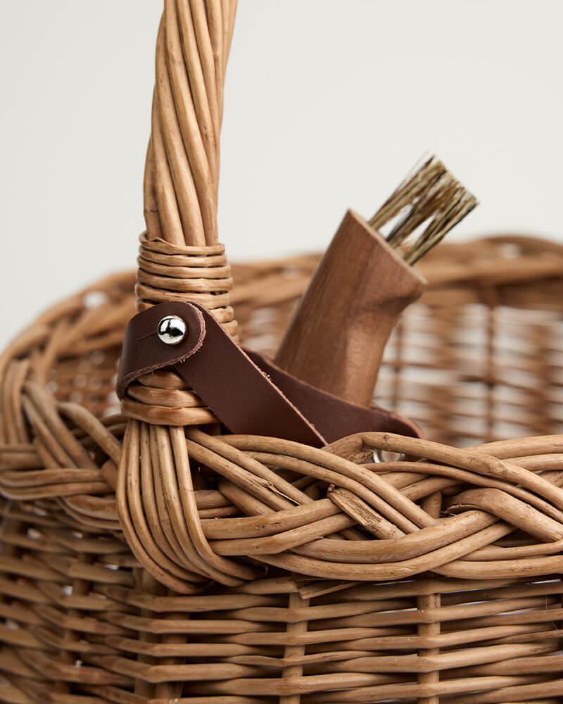 Am Griffende befindet sich eine Naturbürste aus Wildschweinhaar, die ideal ist, um Erde, Schmutz und kleine Insekten schonend zu entfernen, ohne die Pilze zu verletzen.