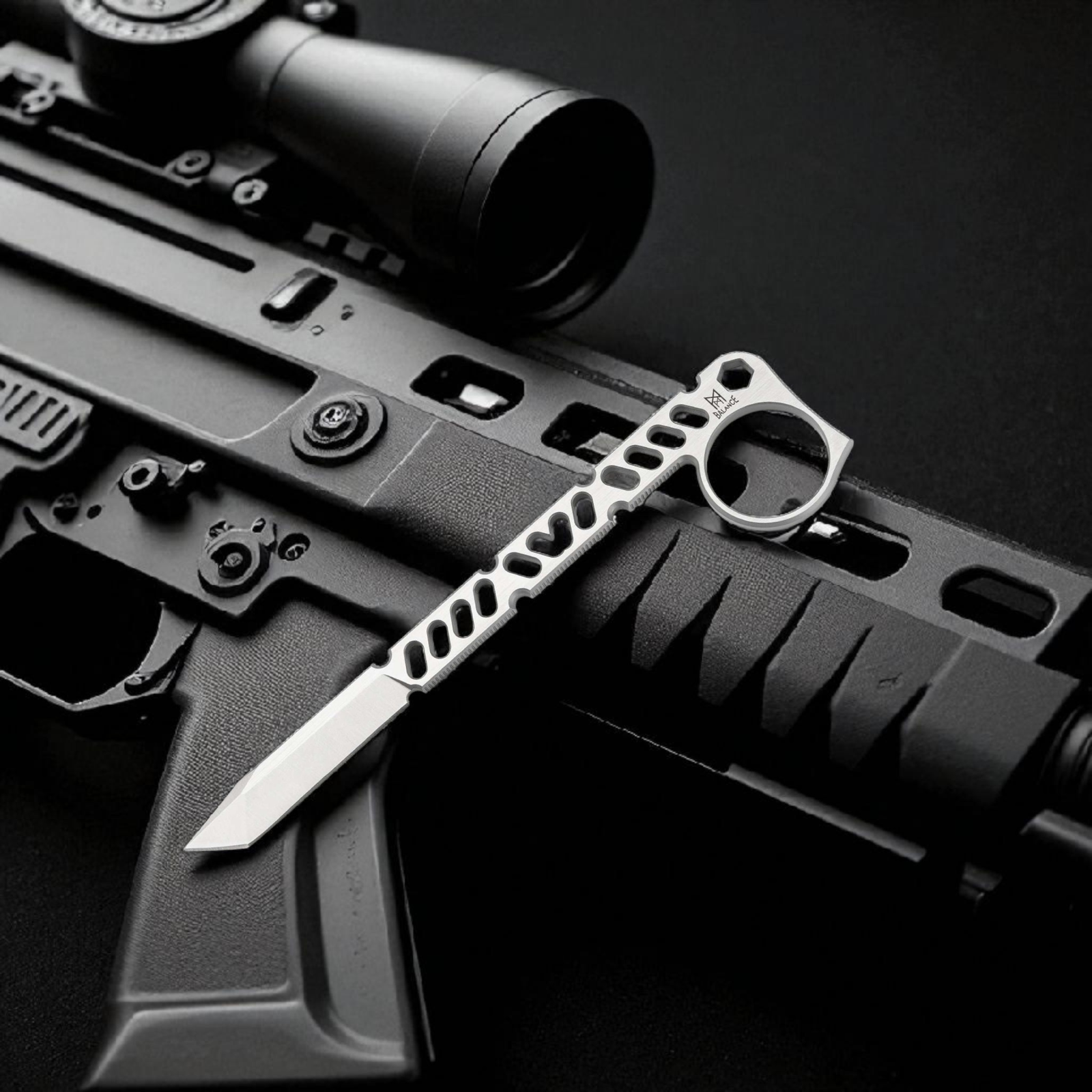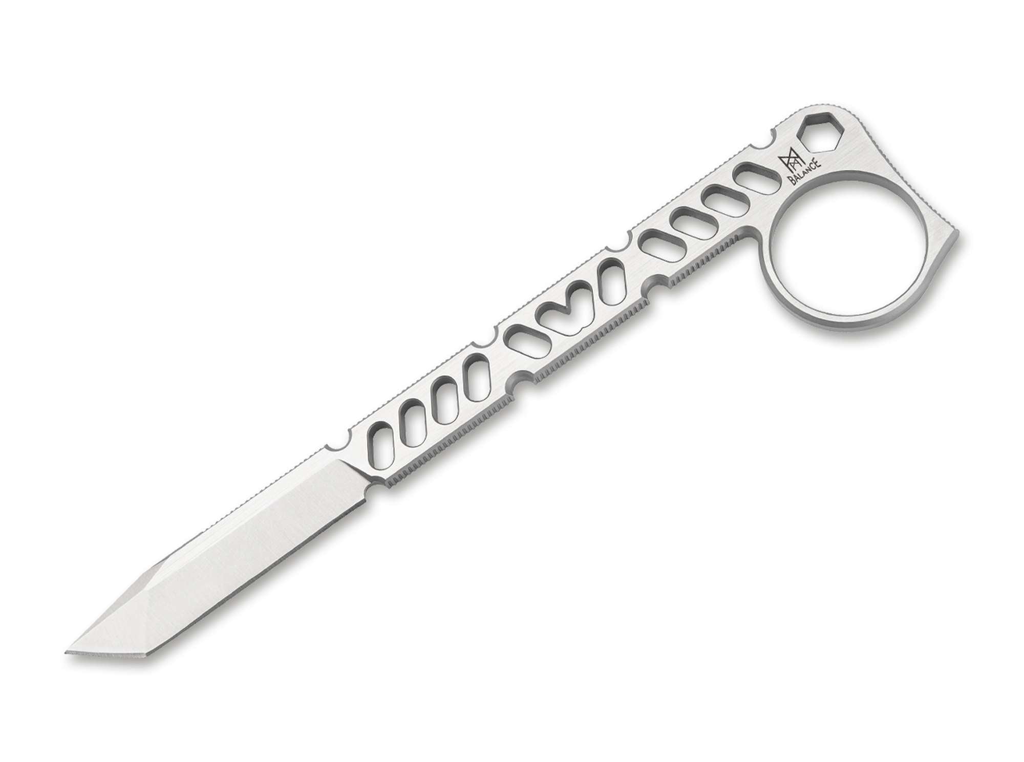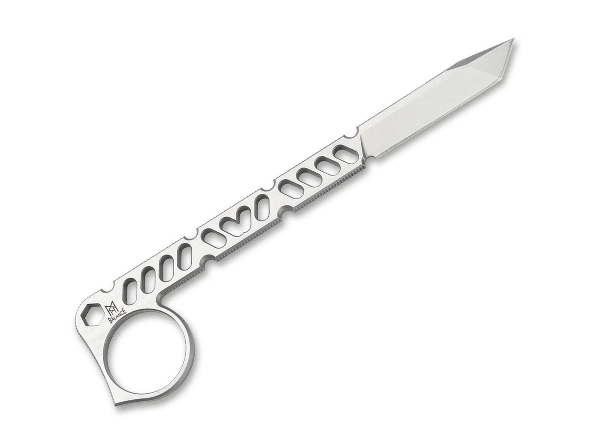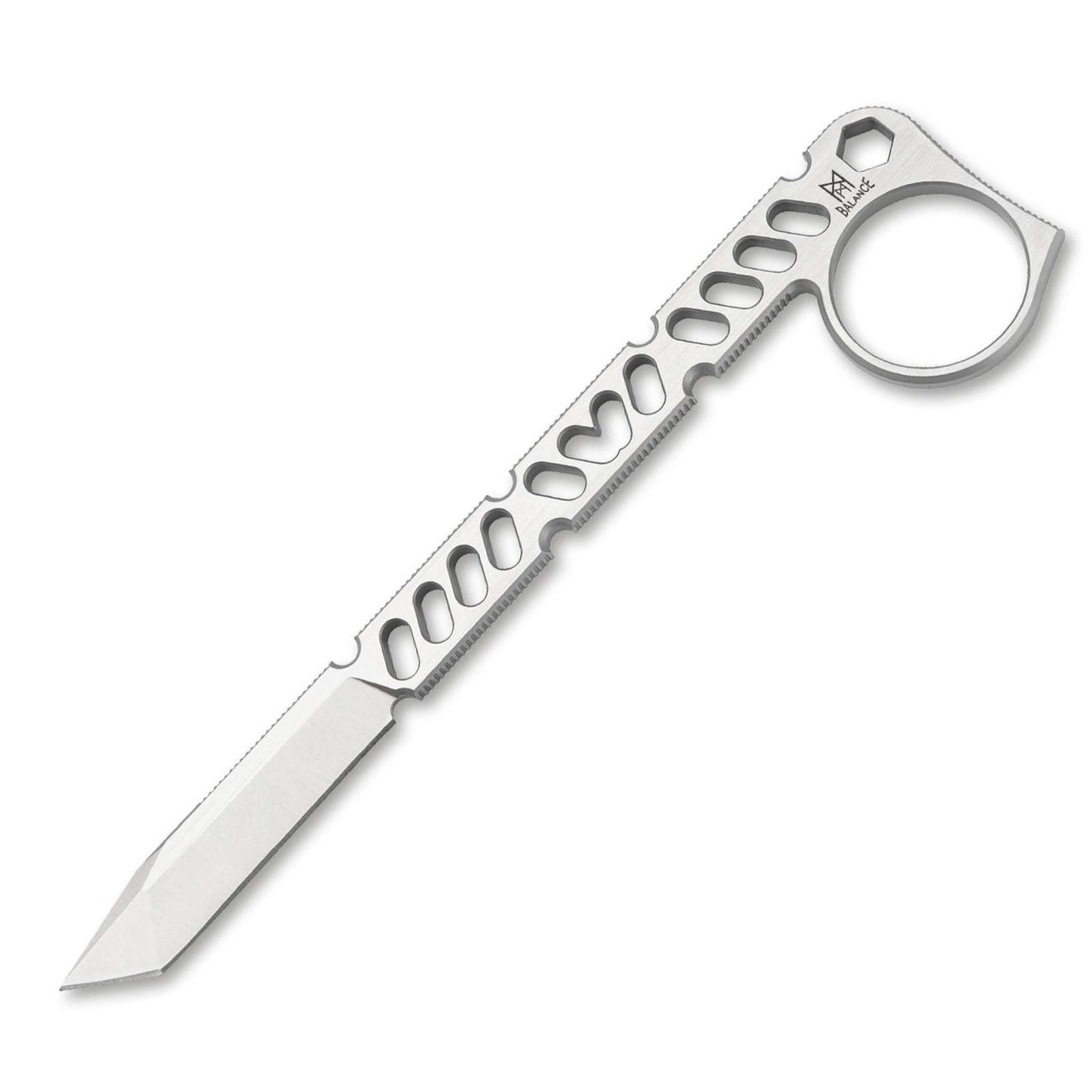 Die Ganzstahlkonstruktion aus 14C28N bietet eine robuste und schnitthaltige Basis. Die prägnante Tanto-Klinge im Satin-Finish überzeugt durch Durchschlagskraft und Vielseitigkeit. Aussparungen im Griff senken das Gewicht auf gerade einmal 41 g, während Riffelungen und der markante Ring am Griffende für sicheren Halt und variable Handhabung sorgen.