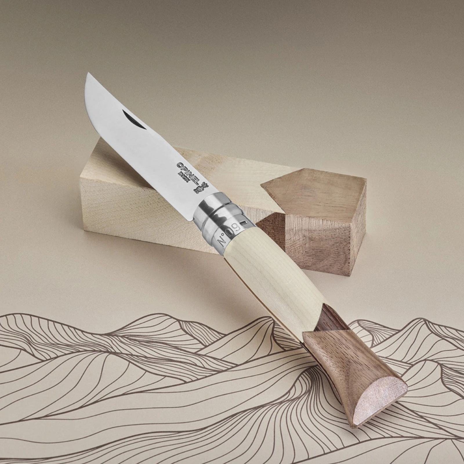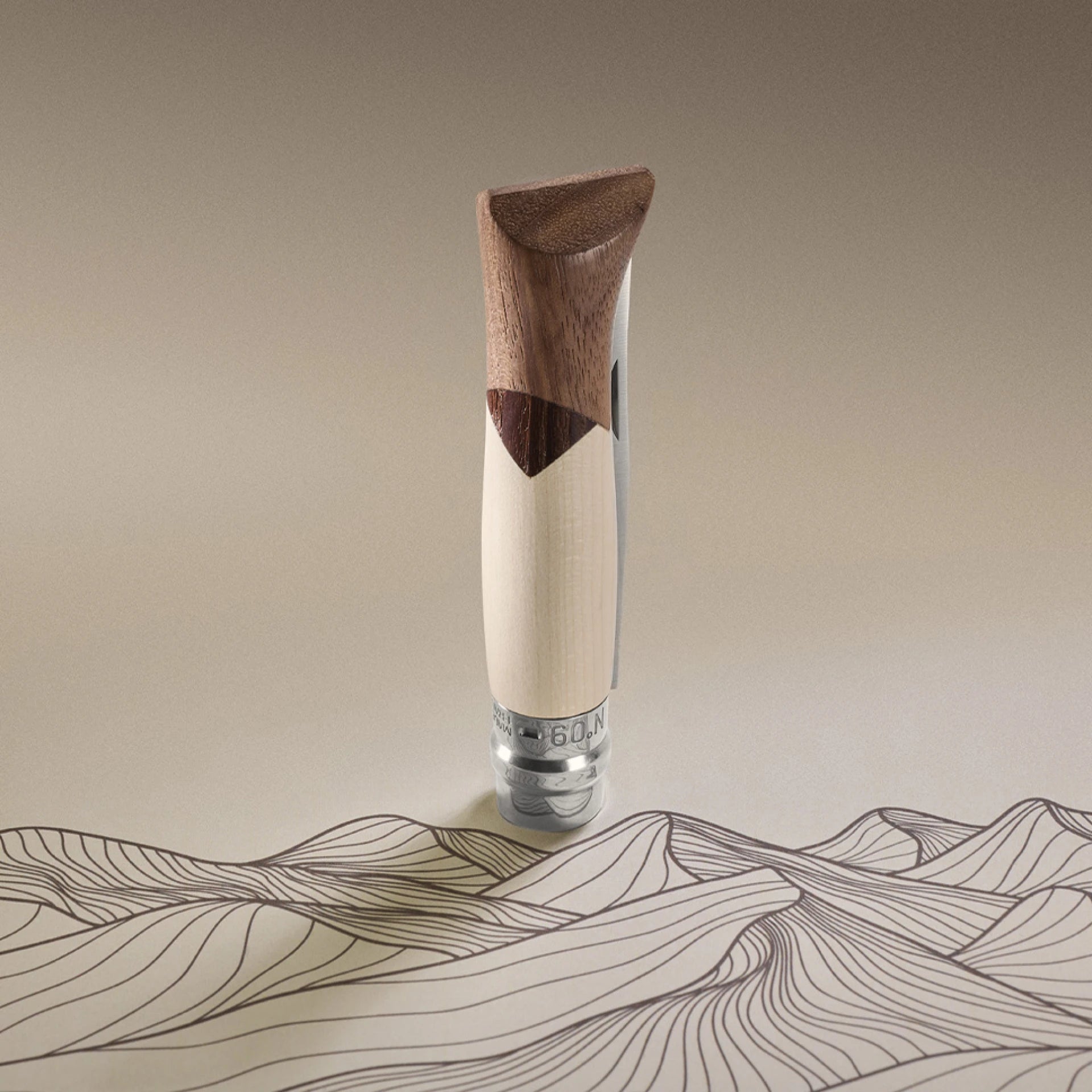 Das Opinel N°09 Cime ist ein luxuriöses Sammlermesser und zugleich ein praktischer Alltagsbegleiter – handgefertigt in Frankreich. Die elegante Kombination aus Bergahorn, wärmebehandelter Esche und schwarzem Walnussbaum macht jedes Exemplar zum Unikat. Inspiriert von den Formen der Berggipfel, vereint dieses Messer höchste Handwerkskunst mit modernem Design.