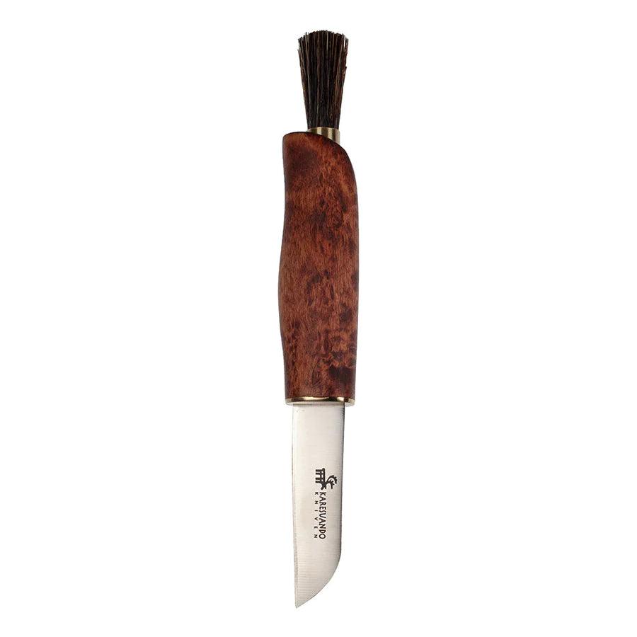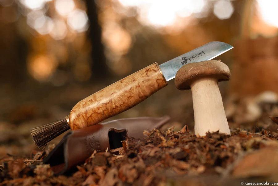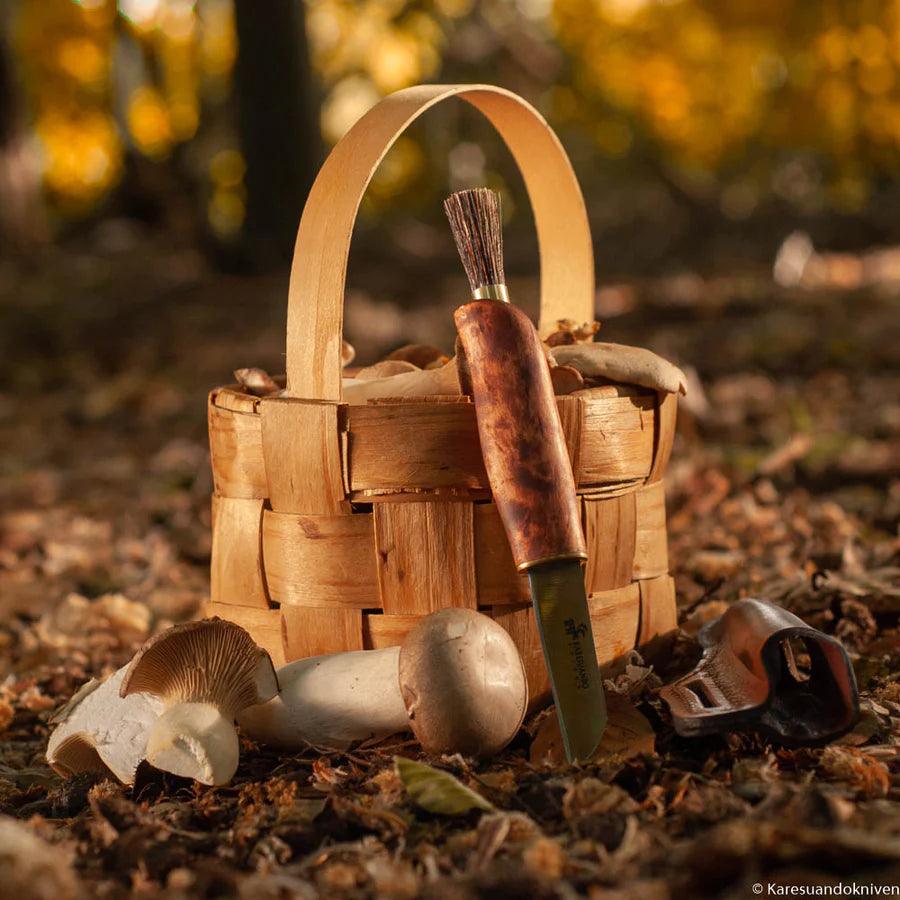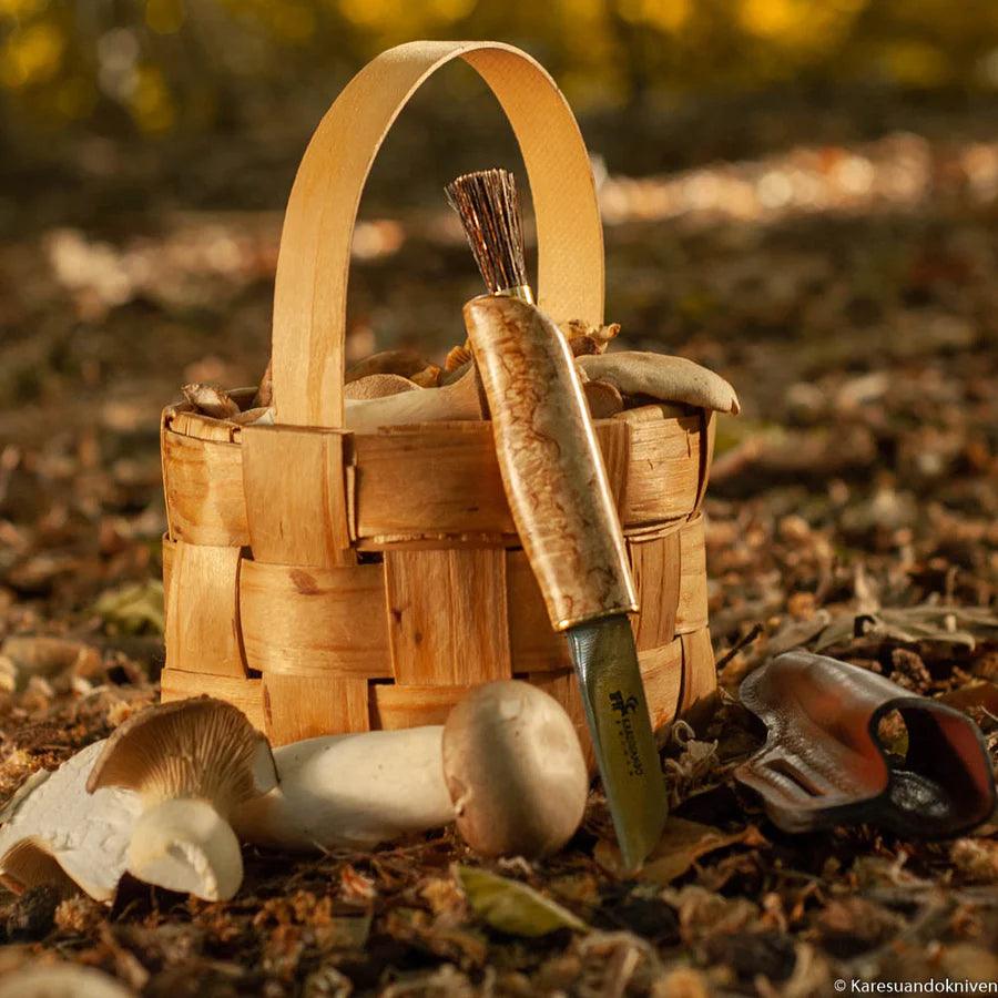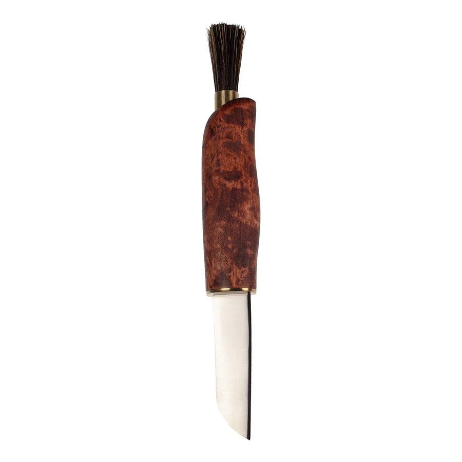 Glattes und elegantes Pilzmesser aus geöltem Maserbirke mit extra dünnem Klinge, 1,5 mm rostfreiem Stahl. An der Spitze ist eine Bürste aus dichten Wildschweinborsten.
