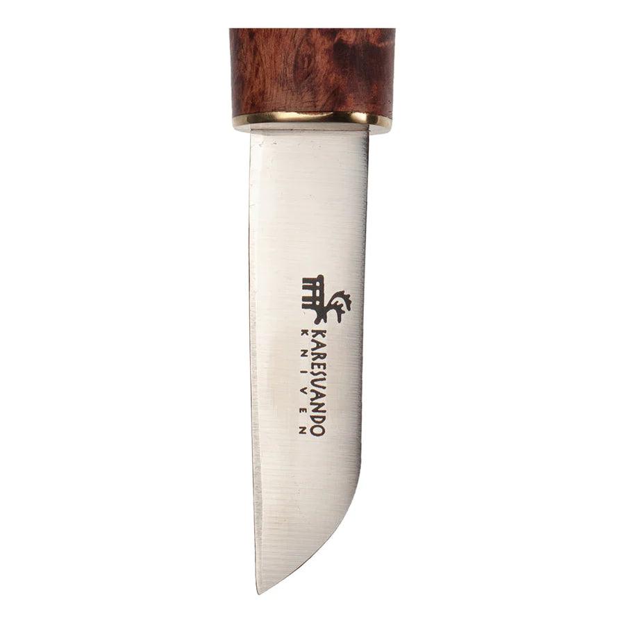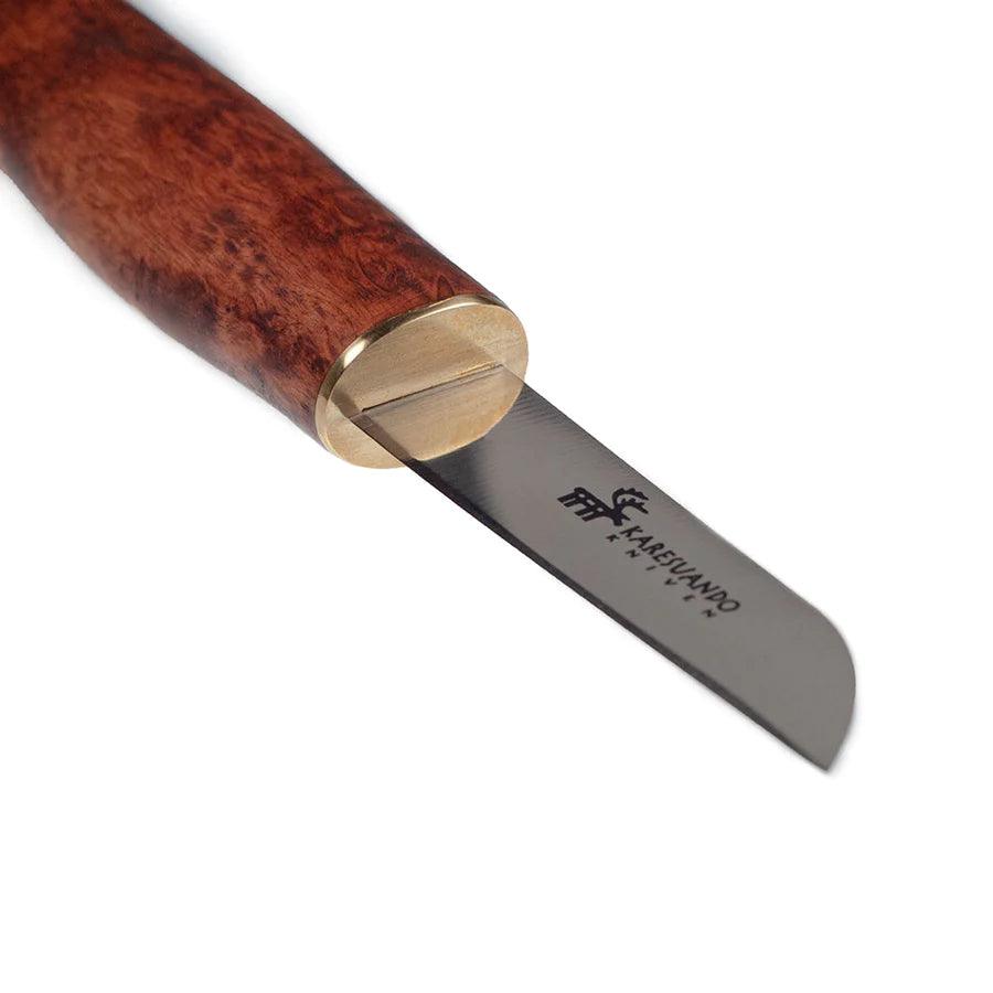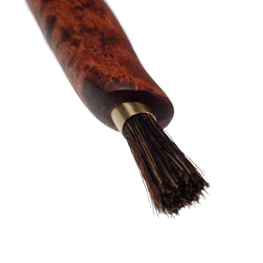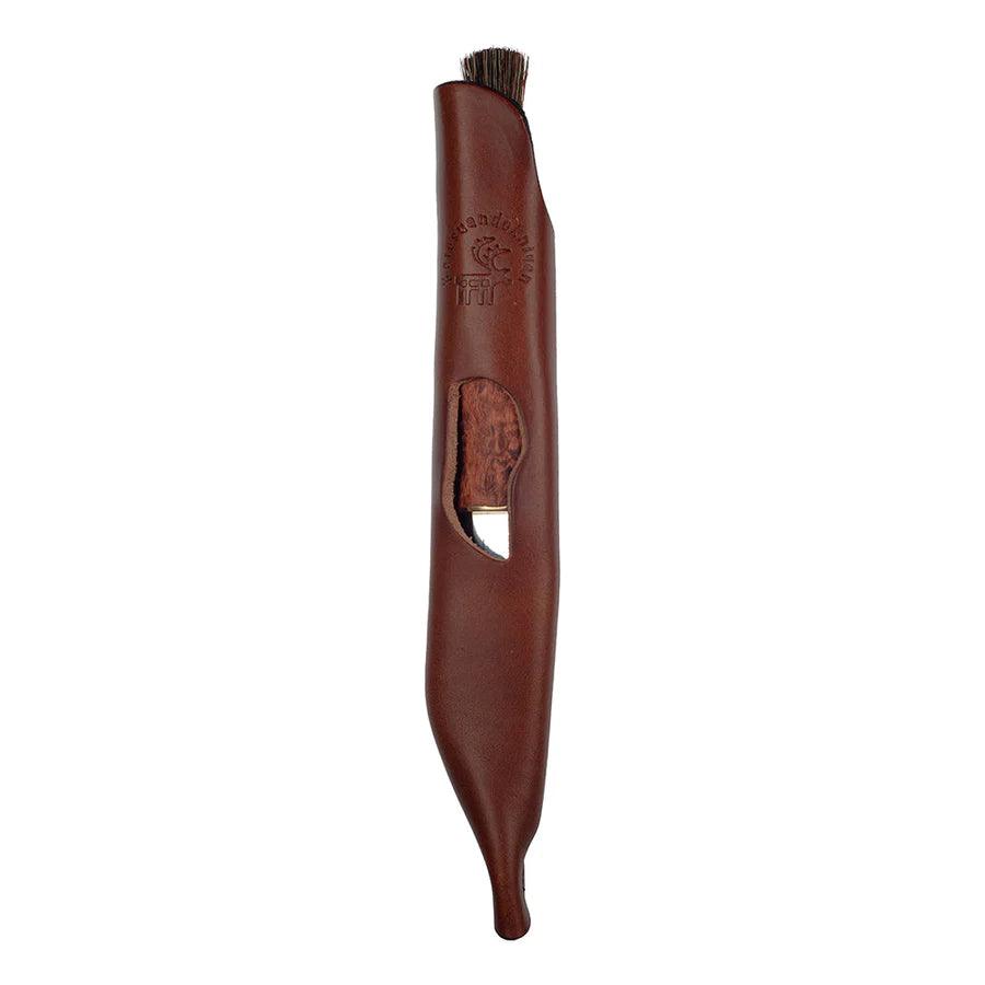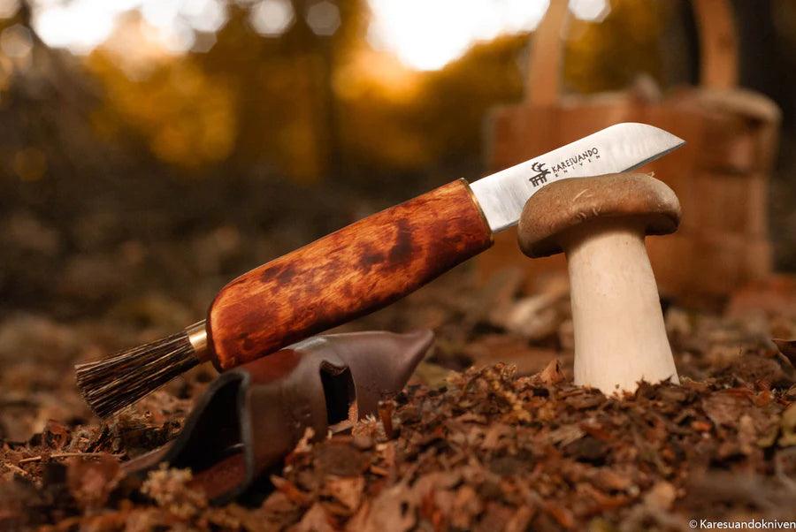 Glattes und elegantes Pilzmesser aus geöltem Maserbirke mit extra dünnem Klinge, 1,5 mm rostfreiem Stahl. An der Spitze ist eine Bürste aus dichten Wildschweinborsten.