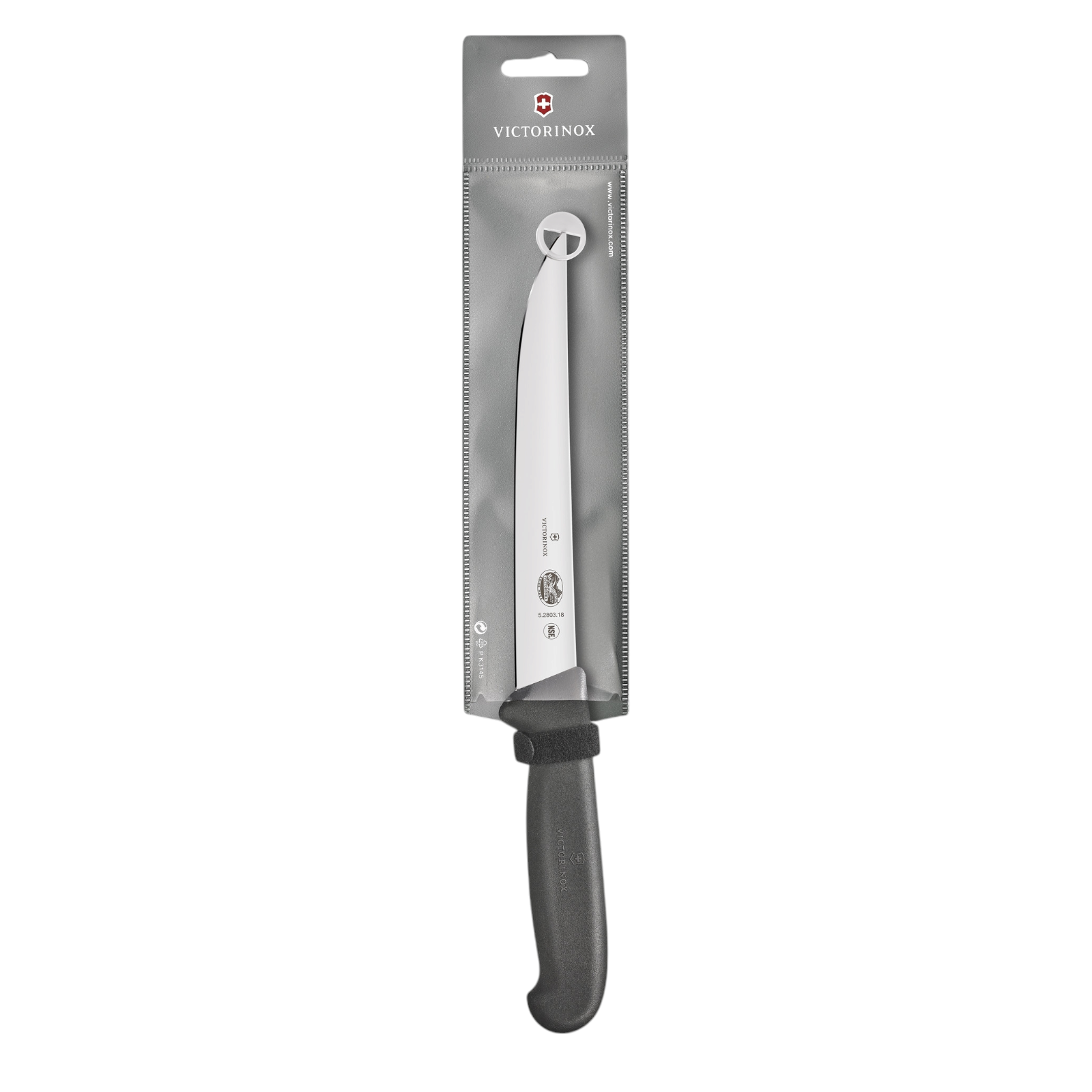 Das Victorinox Fibrox Tranchiermesser ist die perfekte Wahl für präzises Schneiden und Tranchieren. Mit seiner 18 cm langen, schmalen und geraden Klinge gleitet es mühelos durch Fleisch, Fisch und Geflügel. Der rutschfeste Fibrox-Griff aus thermoplastischem Elastomer (TPE) sorgt für sicheren Halt und maximalen Komfort – selbst bei längeren Schneidearbeiten.