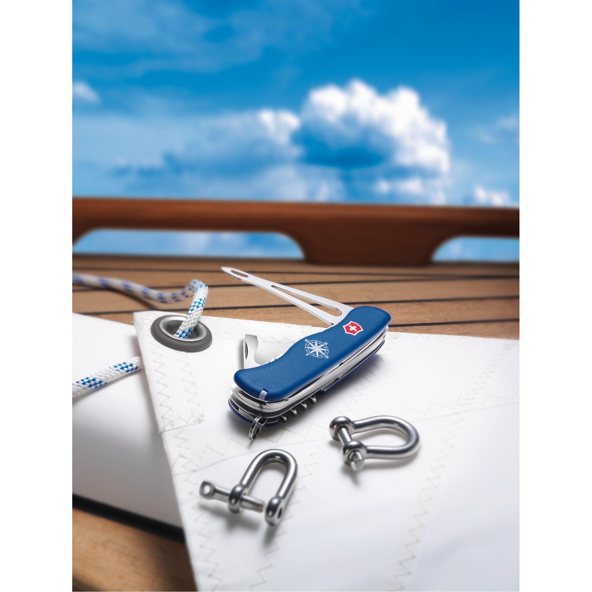Was kann schöner sein als ein perfekter Tag auf dem Wasser? Nur eines: Die Gewissheit, dass Sie für alle Eventualitäten gewappnet sind. Das Skipper Taschenmesser ist wie eine ganze Segelmannschaft in handlicher Grösse und kombiniert die typische Victorinox-Funktionalität mit segelspezifischen Werkzeugen wie einem Schäkelöffner und einem Marlspieker. So sind Sie stets bereit für kniffelige Knoten und widerspenstige Schäkel.