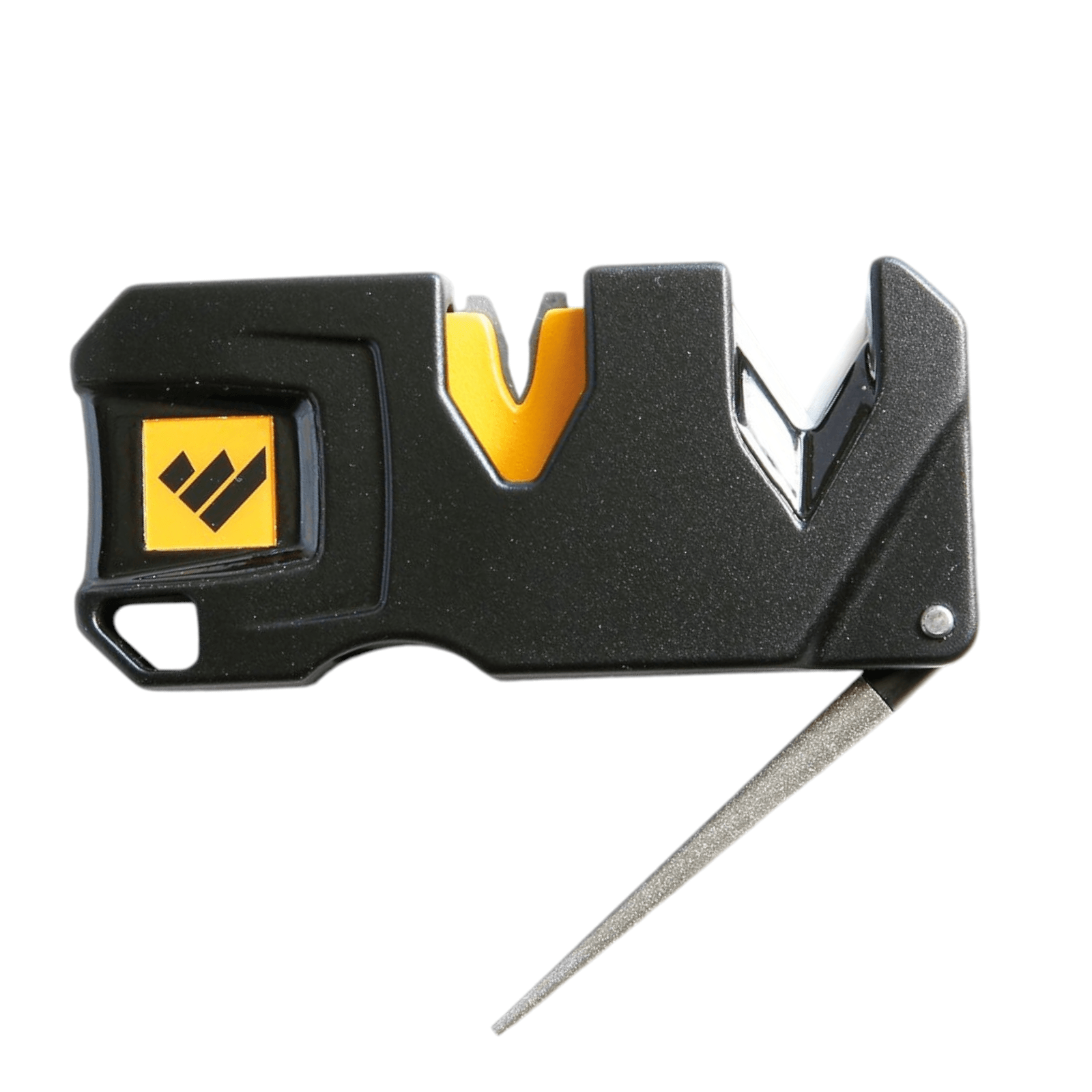 Der Pivot Plus Knife Sharpener von Work Sharp ist ein praktischer Messerschärfer, der neben gekreuzten Karbidelementen und Keramikstäben zusätzlich über einem ausklappbaren konischen Diamantschärfer für Wellenschliffe verfügt. Die Grundschärfe wird über zwei gekreuzte Karbidelemente erzeugt, während der Feinabzug mit den beiden Keramikstäben erfolgt. Dank der integrierten Federung folgen die Karbidelemente der Form der Klinge, wodurch das Ergebnis deutlich gleichmäßiger wird. Der extrem leichte Messerschärfer kann problemlos in der Jackentasche oder dem Werkzeugkoffer verstaut werden und ist zusätzlich mit einer Fangriemenöse ausgestattet.